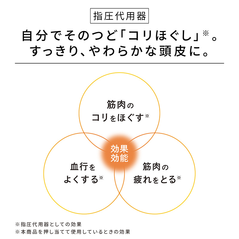 指圧代用器の機能を持つ独自設計で、「筋肉のコリをほぐす*」「血行をよくする*」「筋肉の疲れをとる*」の3つを叶えます。感覚がにぶく、コリをためやすい頭皮には、そのつどほぐす習慣を。すっきりと軽く、やわらかな頭皮へと導きます。