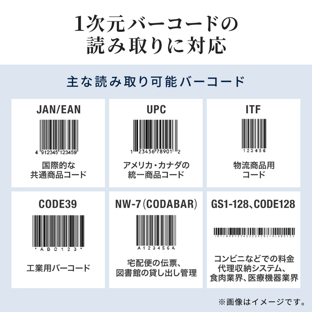 ■多数の1次元コードの読み取りに対応します。JANコード、物流などで使われるITFコードやGS1-128など主要コードの読み取りも可能です。