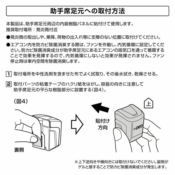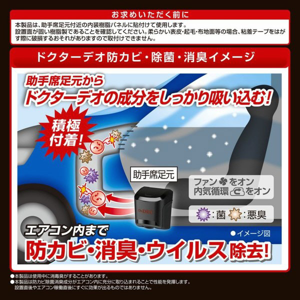 助手席足元に取り付けておくだけで、防カビ除菌消臭成分がエアコン内部に吸い込まれ、エアコン内をしっかり防カビ・除菌・消臭します。