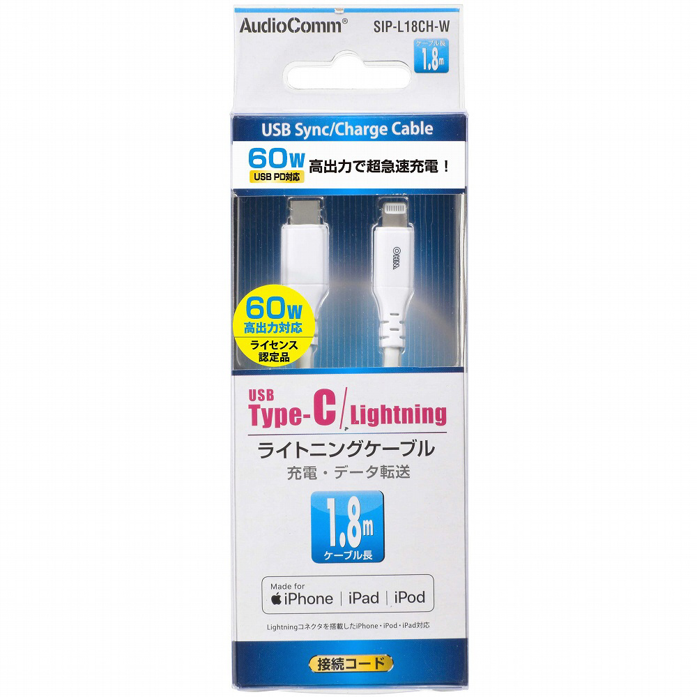 ライトニングケーブル TypeC 1.8m AudioComm ホワイト SIP-L18CH-W [USB Power Delivery対応]