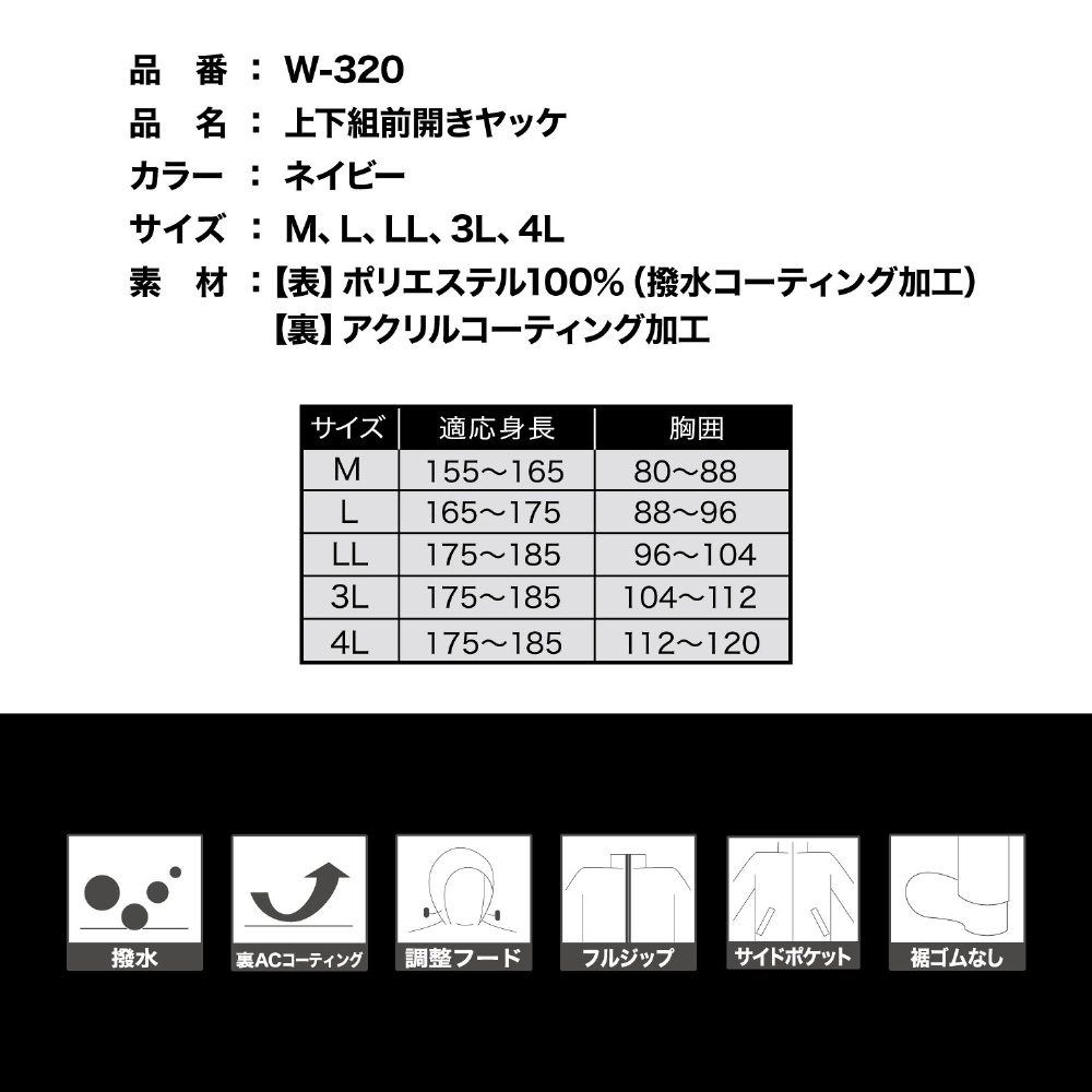 上下組前開きヤッケ ブラック L W-320 BK L ブラック W-320
