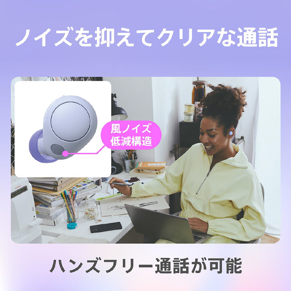 スマートフォンやiPhone、PCでのハンズフリー通話(*)が可能。通話時に周囲のノイズを抑えて集音するノイズサプレッションにより、騒がしい環境でもノイズを抑え高い通話性能を実現します。さらに、風切り音を低減する構造によって、通話時時の風によるノイズを抑制して集音します。発話者の声をよりクリアに通話相手に届けることができます。