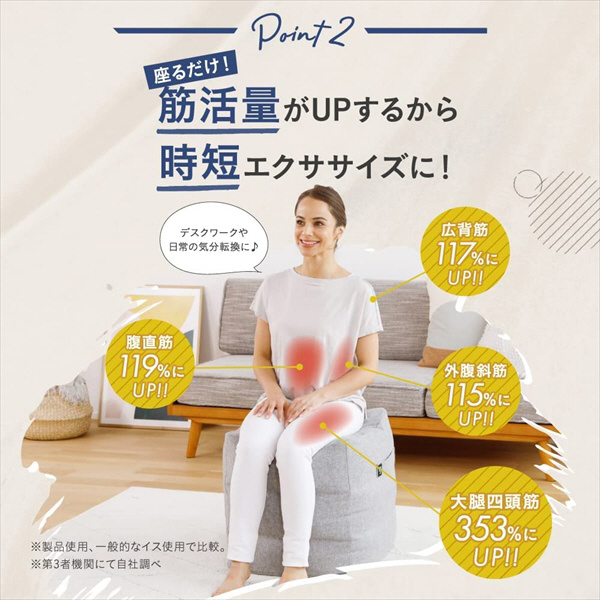 座り姿勢が自然と整い色々な部位の筋肉にアプローチ。在宅ワークなどの座り疲れも軽減します。