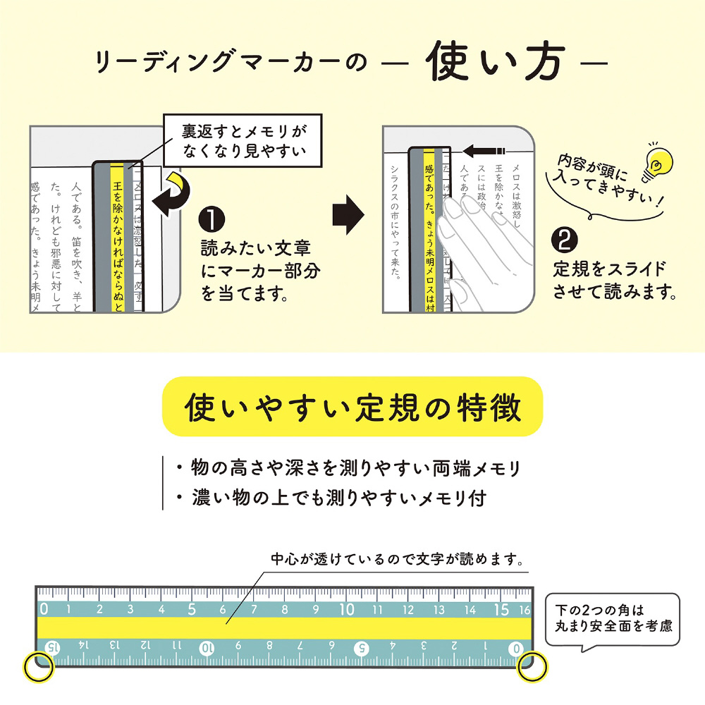 文字がスラスラと読める窓付き。勉強に集中できる定規。