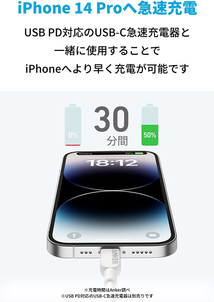 USB PD対応のUSB-C急速充電器 (別売り) と一緒に使用することで、iPhone 14 Proを30分で50%まで充電可能です。