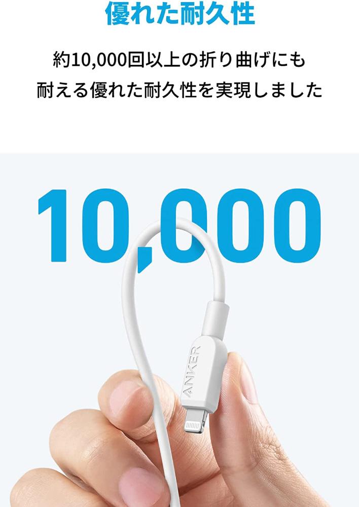 10,000回以上の折り曲げにも耐える優れた耐久性を実現しているため、ケーブル内部のワイヤーを断線から保護し、安心して充電することができます。