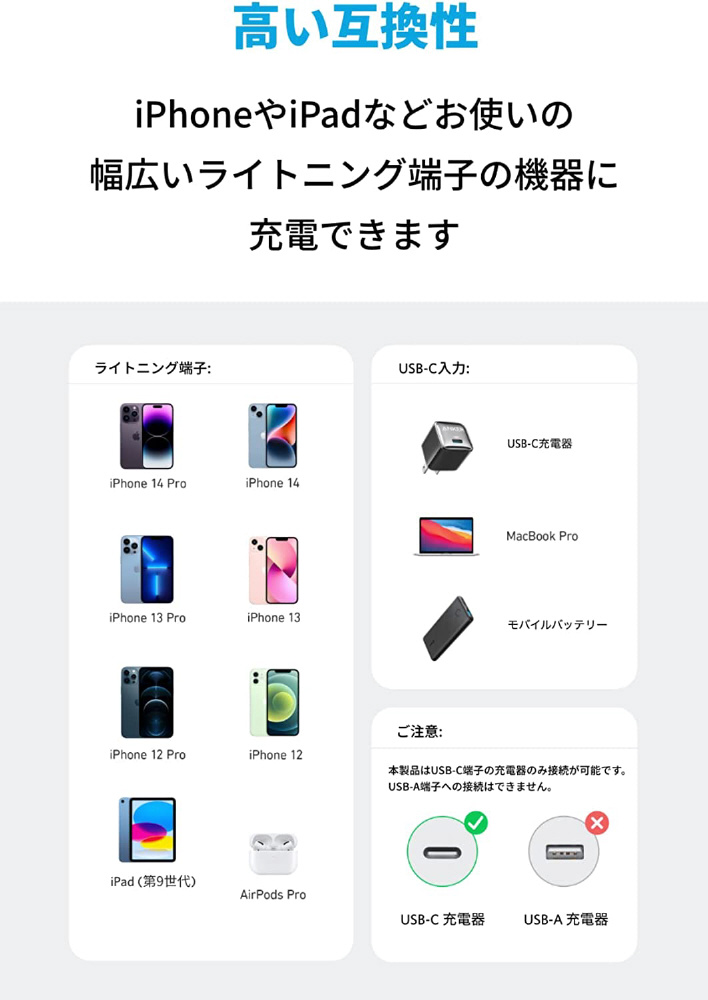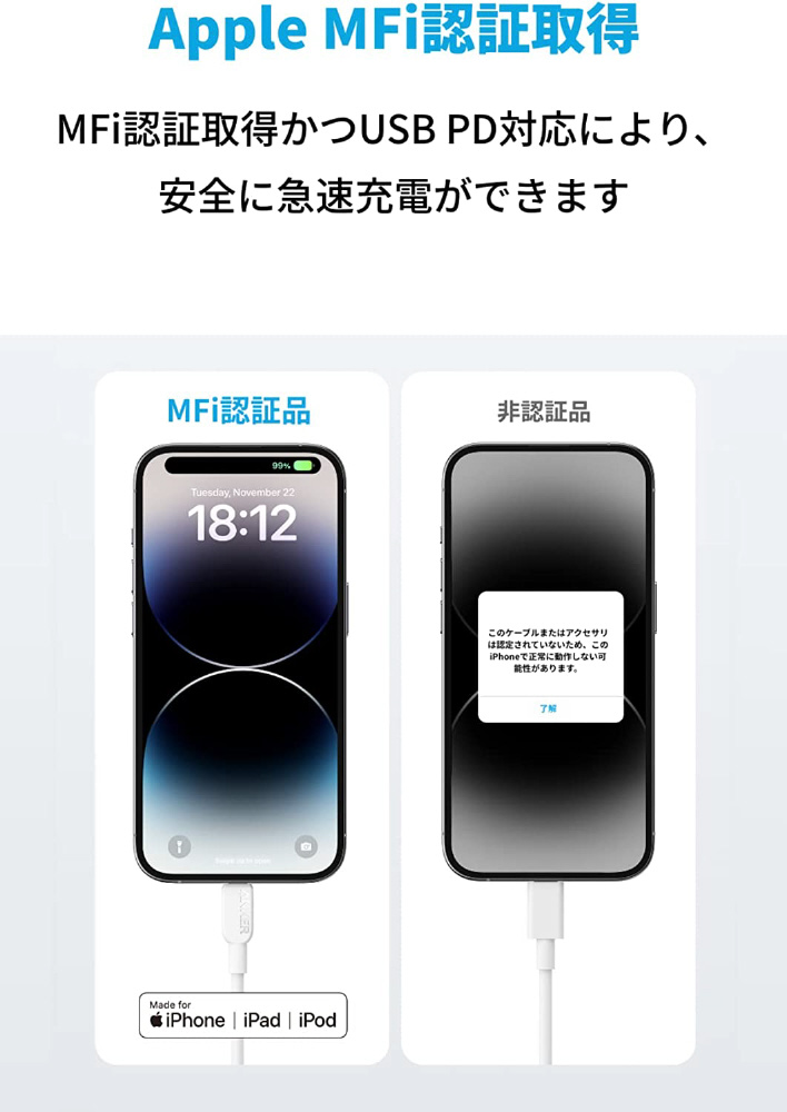 Apple MFi認証済みに加え、弊社による厳格な品質検査を実施しており、iPhoneやiPad、iPod、その他お使いのライトニング端子機器を安全にかつ急速充電していただけます。