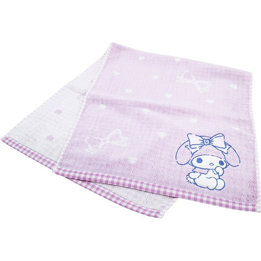 落ち着いた色合いで大きなマイメロディの刺繍がかわいらしいタオルです。