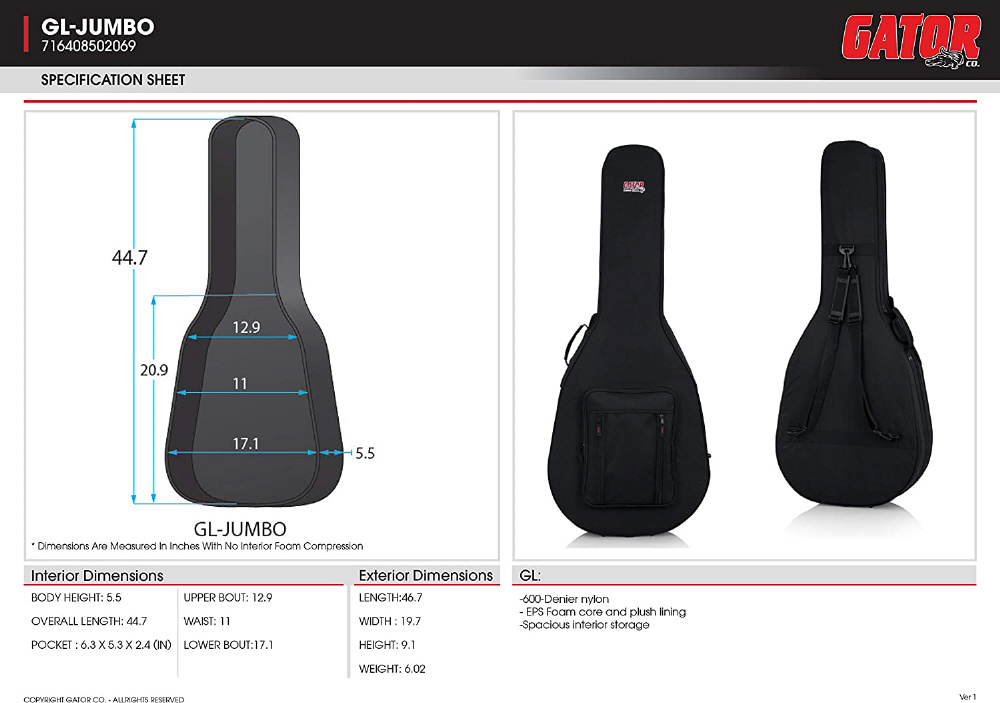GATOR ゲーター アコースティックギター用 軽量セミハードケース GL Guitar Series EPS製 GL-JUMBO (ジャンボタイプ対応)