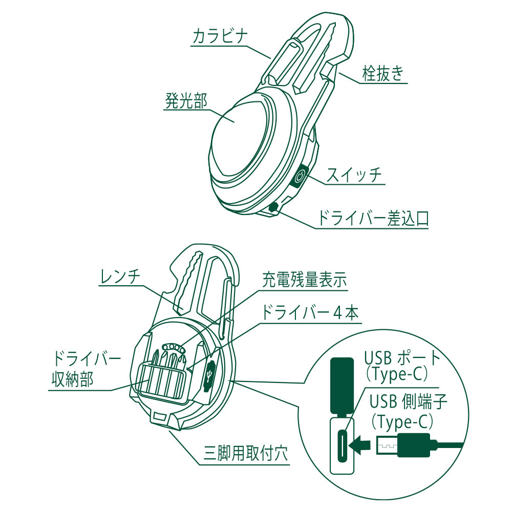 ● 栓抜き/レンチ/ドライバー(4種)ツール、カラビナ付き