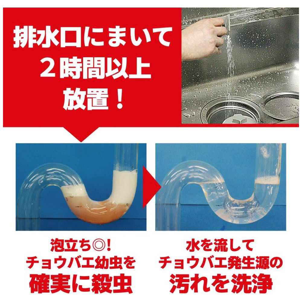 チョウバエ幼虫、ショウジョウバエ幼虫の駆除、ヌメリ、油汚れ、湯垢の洗浄、除菌、防臭