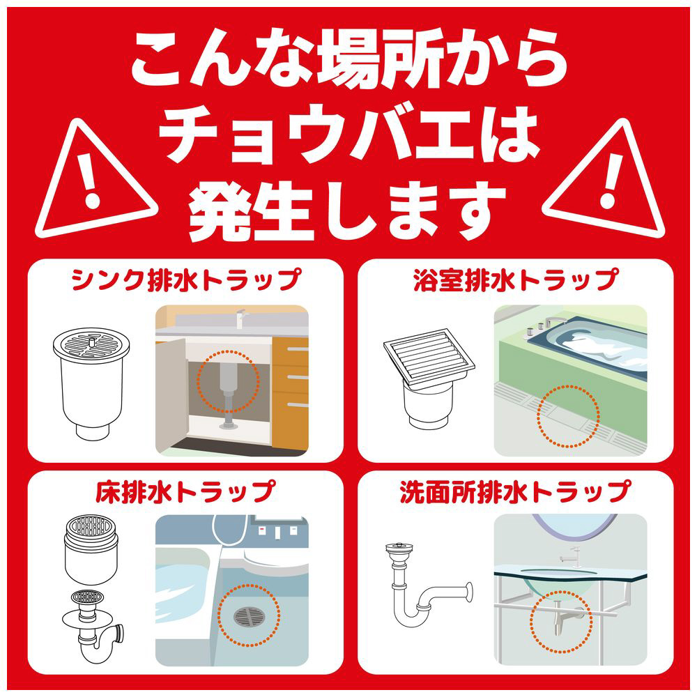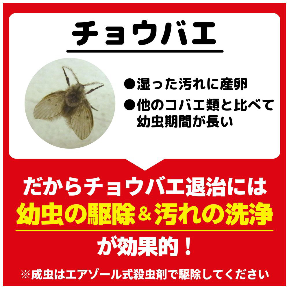 ●殺虫成分と漂白成分の力で、水回りに発生するチョウバエの幼虫を殺虫します