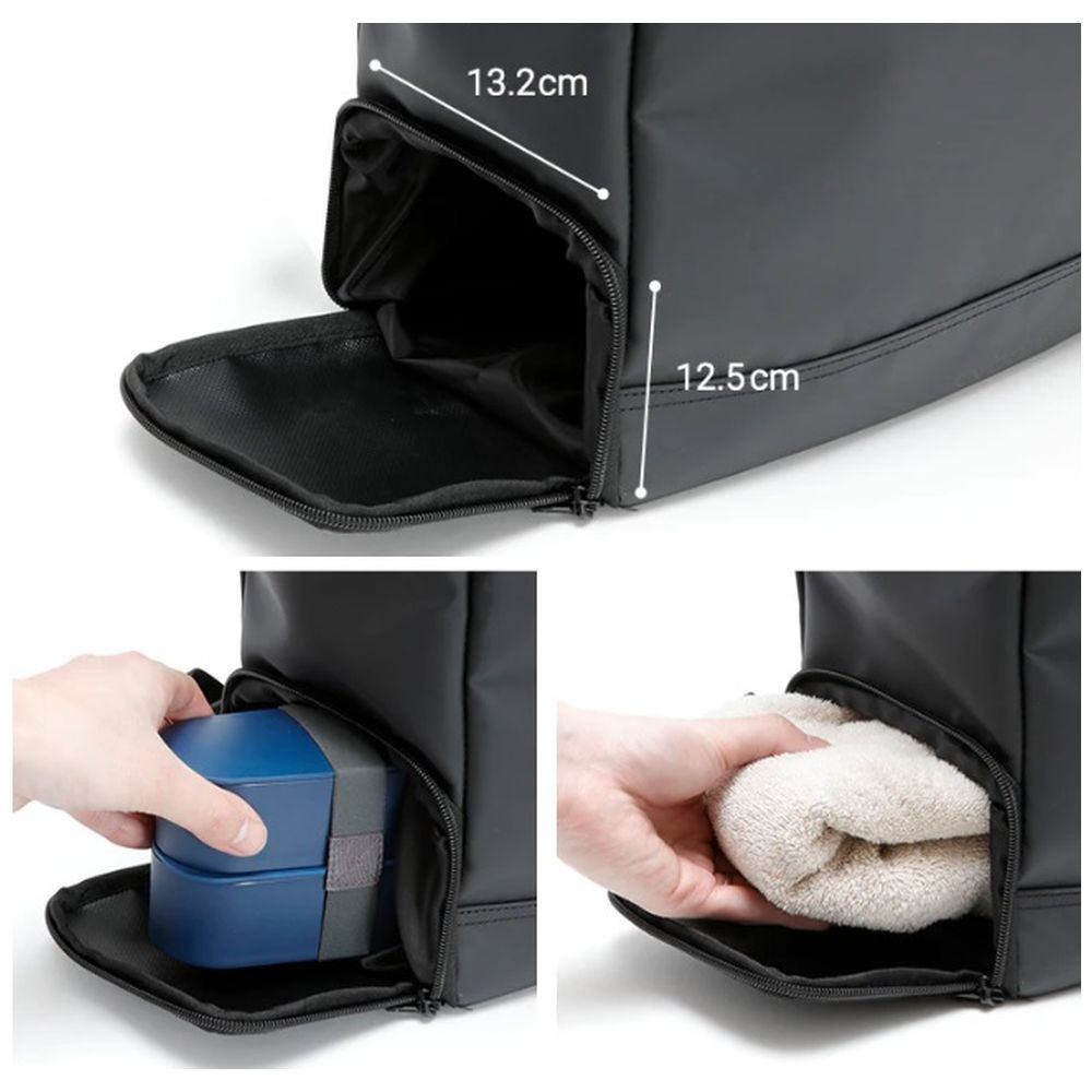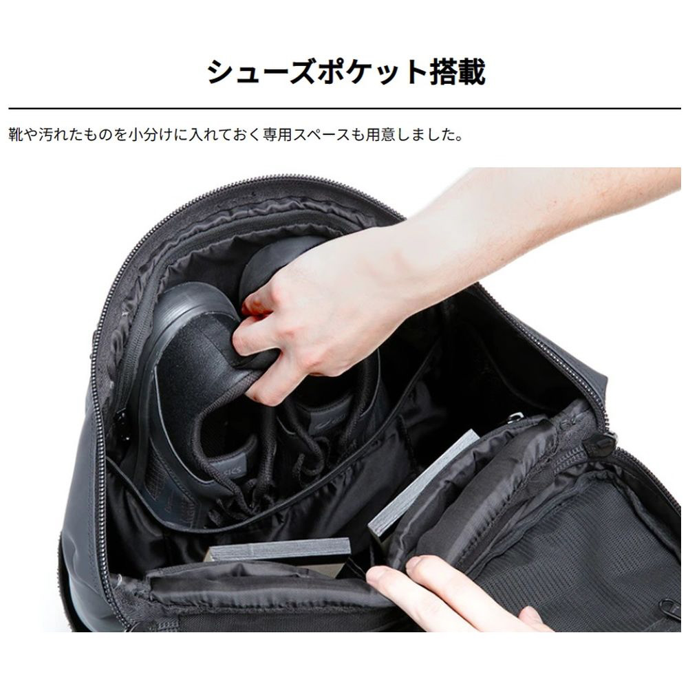 撥水・防汚・防傷素材で雨や汚れから荷物を守り、シューズポケットも搭載しているため、靴を別に収納できます。