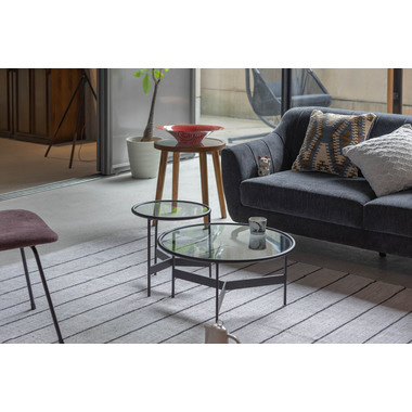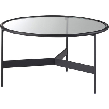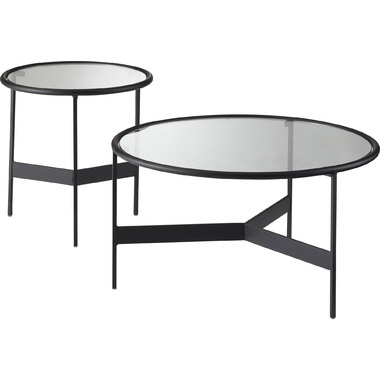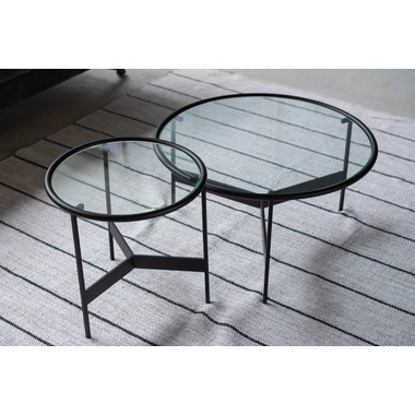マットなブラックアイアンの滑らかな曲線とハードなガラスを組み合わせた2サイズのローテーブル。