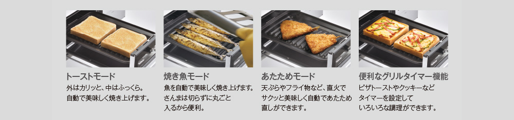 焼き網の代わりにココットプレートでグリル料理。焼き魚はもちろん、トースト、ノンフライ調理、ピザ、揚げもののあたため直しも、スイッチひとつで自動調理。充実の便利機能でグリル調理の幅が広がります。