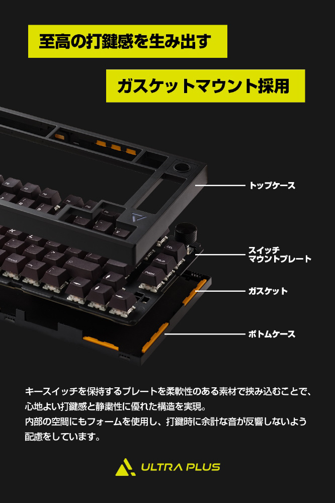 柔軟性のあるガスケットをトップケースとボトムケースそれぞれに装着し、スイッチマウントプレート(キースイッチを保持するプレート)を挟み込むことで、心地よい打鍵感と静粛性に優れた構造を実現しました。