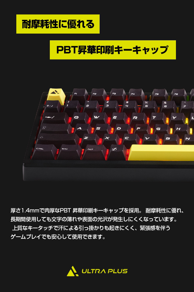厚さ1.4mmで肉厚なPBT昇華印刷キーキャップを採用。長期間使用しても文字の薄れや表面の光沢化が発生しづらく、非常に耐久性が高いです。汗による指の引っ掛かりも起きにくく、緊張感を伴うゲームプレイでも安心です。
