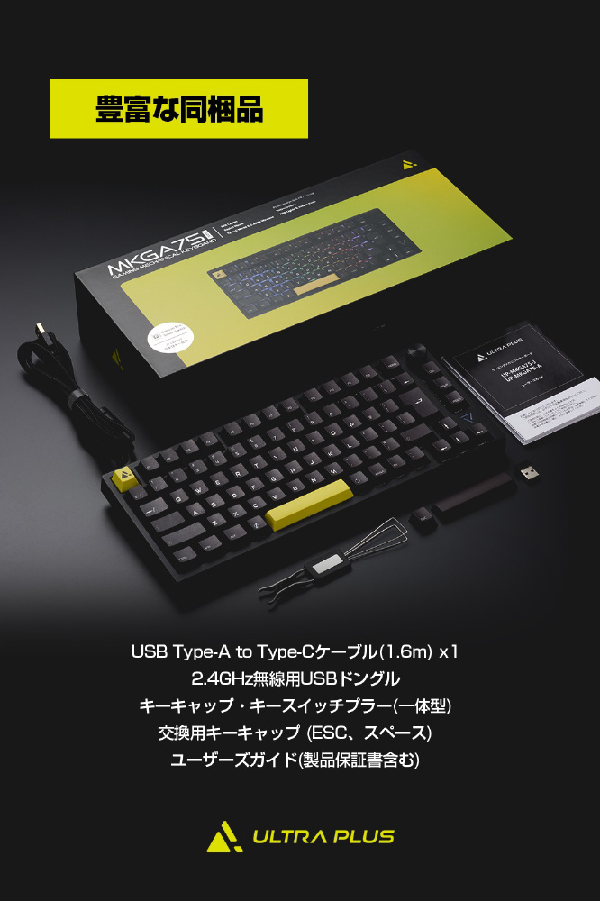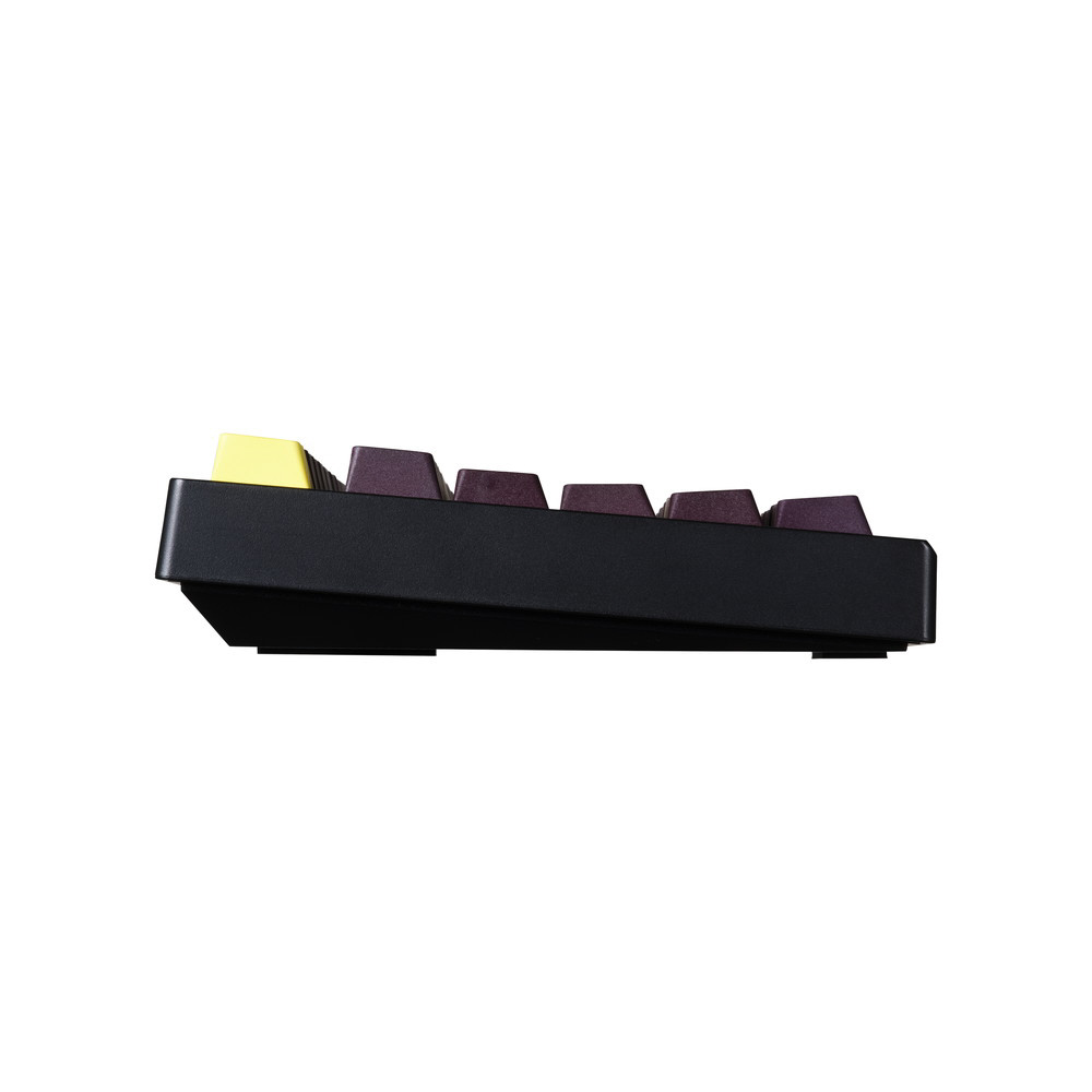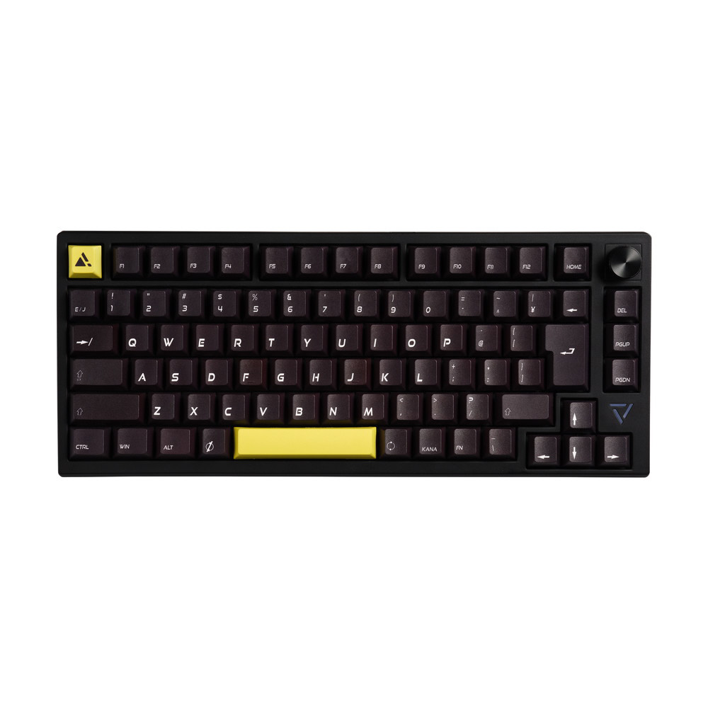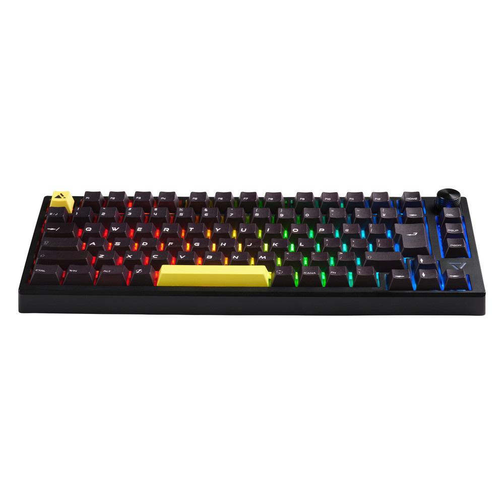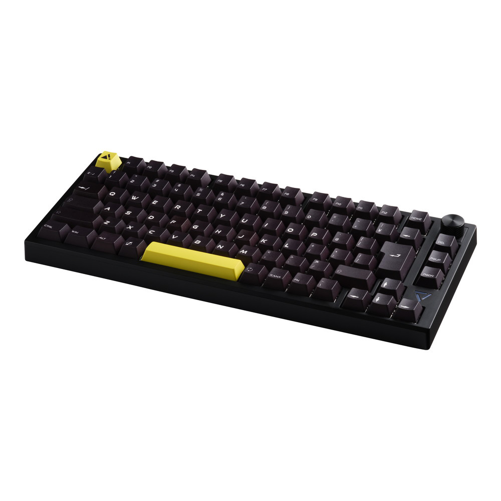 数パターンのライティングが楽しめるRGB LEDライトに、高級感あふれるアルミ削り出しの音量調節用ノブを装備。黄色いESCキーとスペースキーは付属の黒いキーキャップへ変更可能で、部屋の内観に合わせて使用できます。