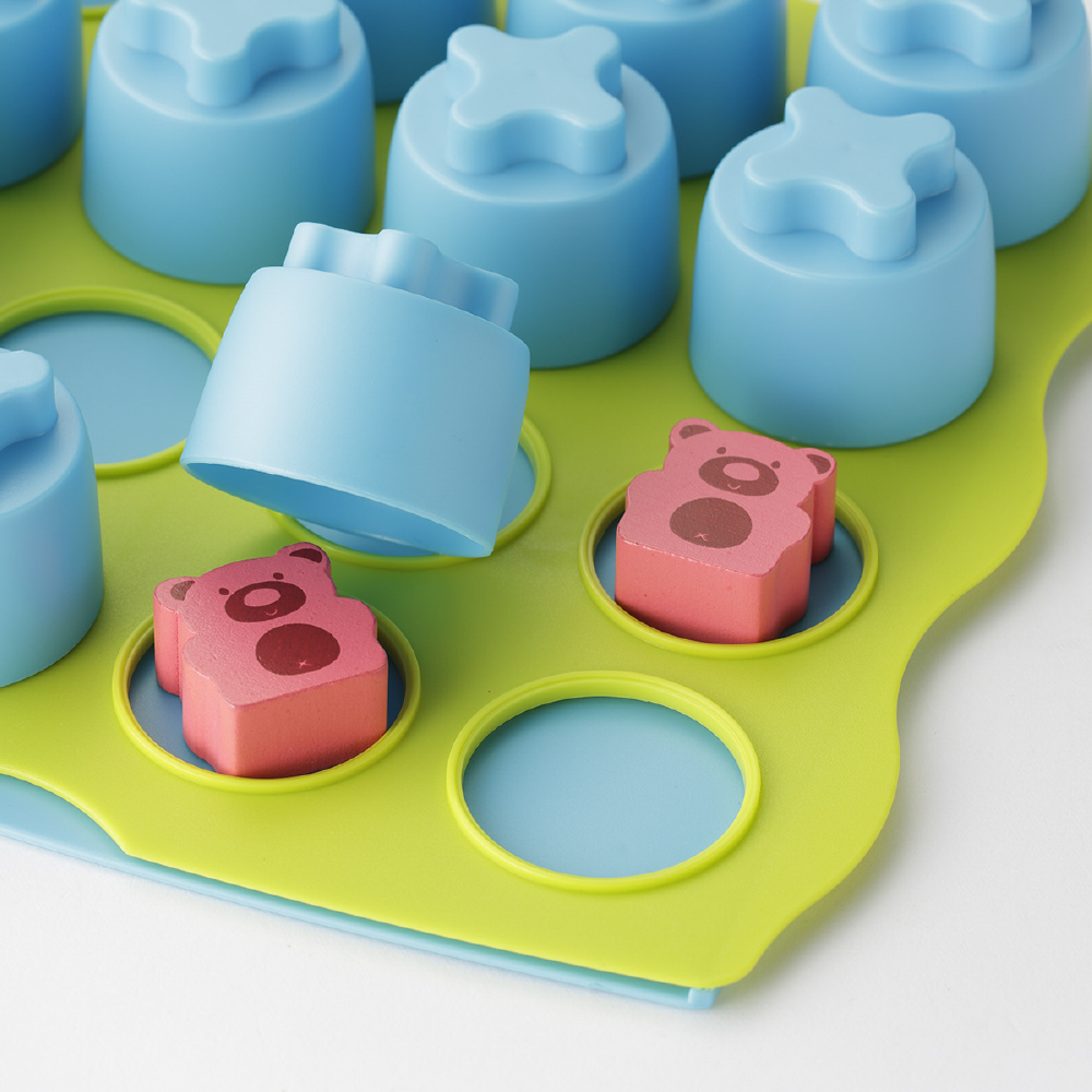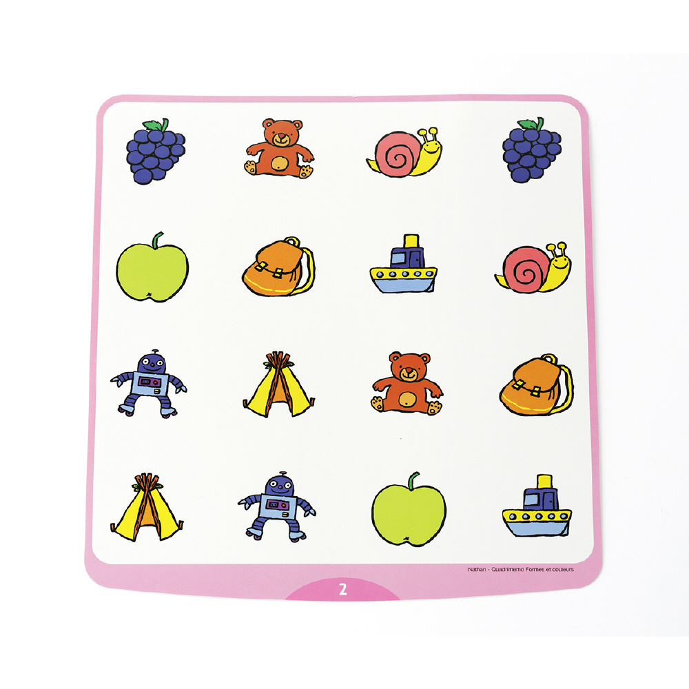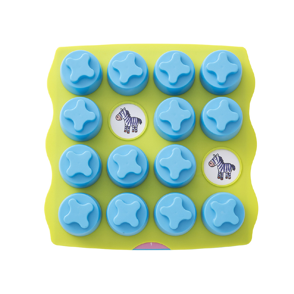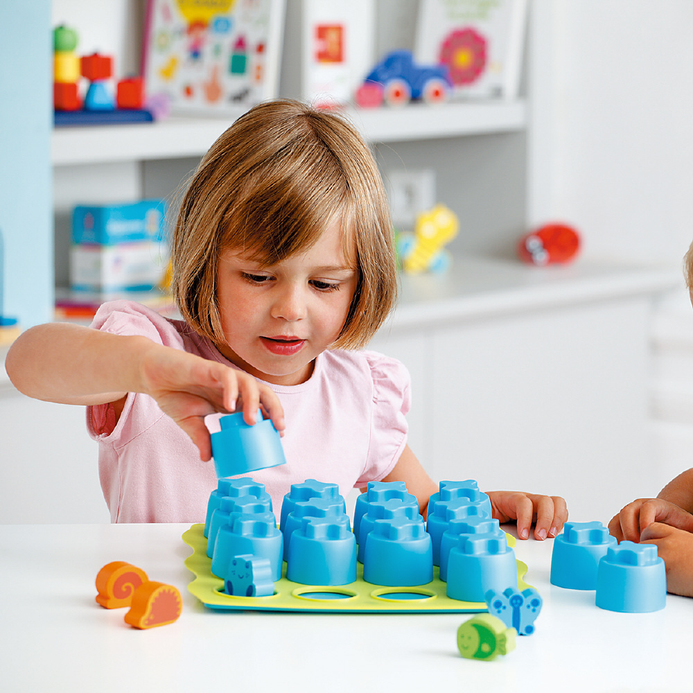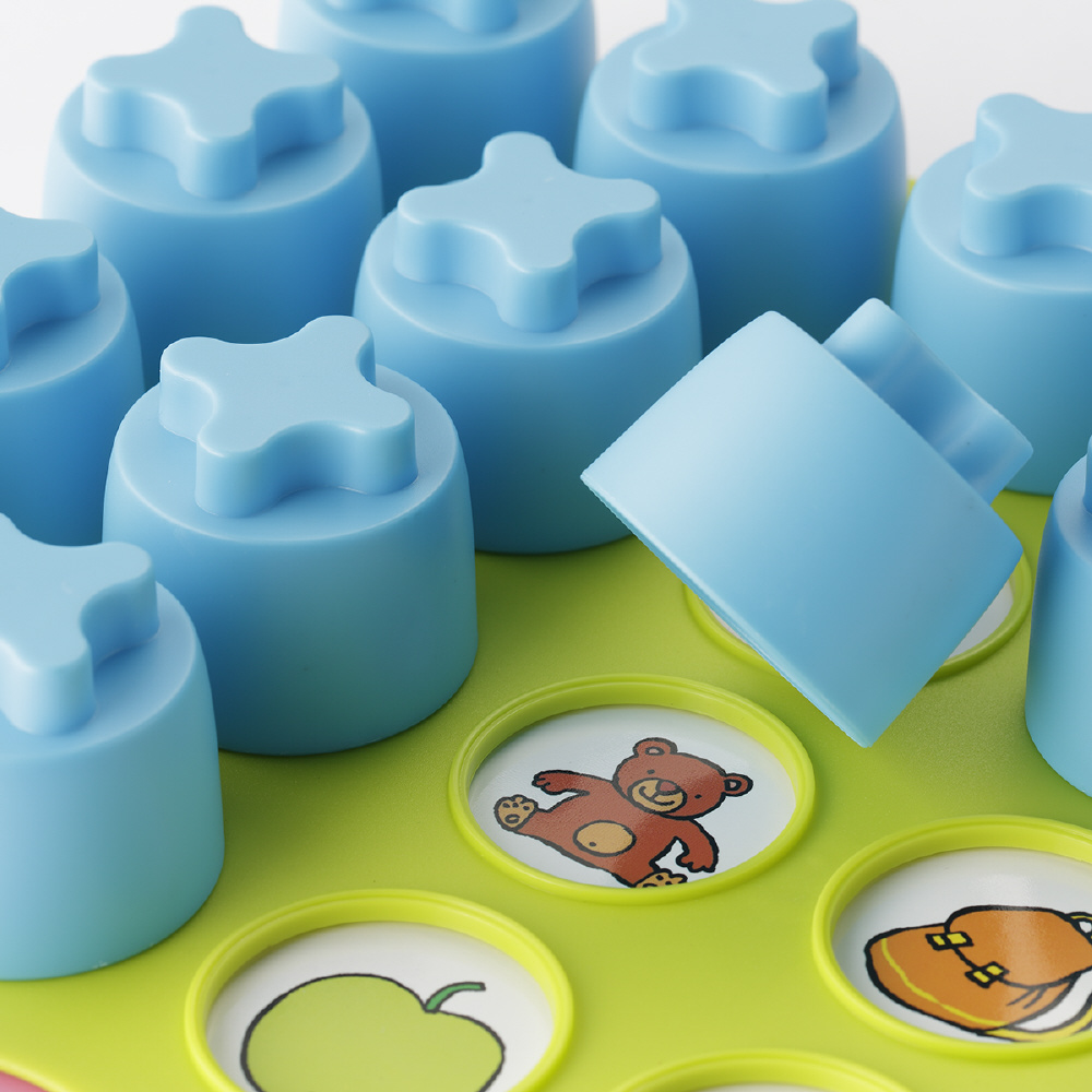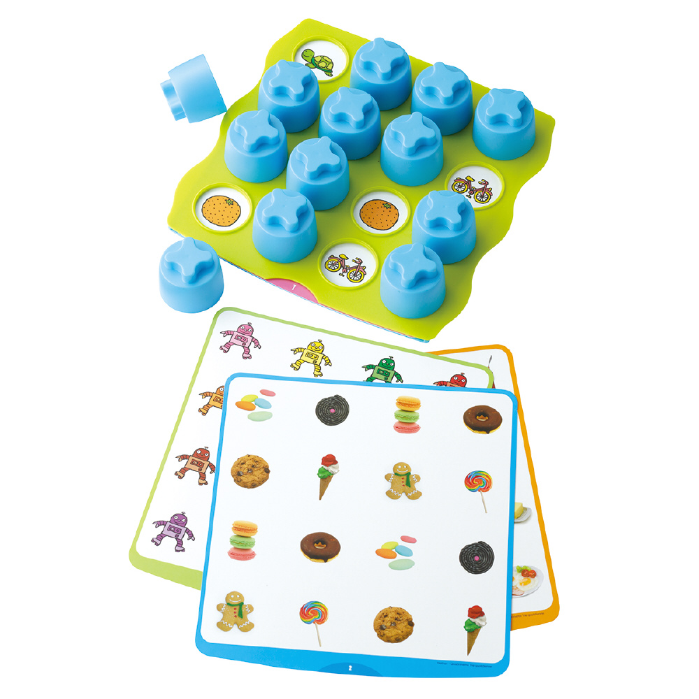複数の絵を見比べて、「同じ・違う」を認識すること、「記憶すること」は小さな子どもにとっては難しいですが、フタを開けて見つけていくという「あそびの要素」が加わることで、楽しいあそびに変化します。遊びながら、たくさんのブロックの中から楽しく色や形を見て違いや共通点を見分ける認知力、物の位置関係を覚える記憶力を育て、年齢に合わせて同じ絵柄を探すあそびから、しっかり記憶して探し当てる遊びまで楽しむことができます。