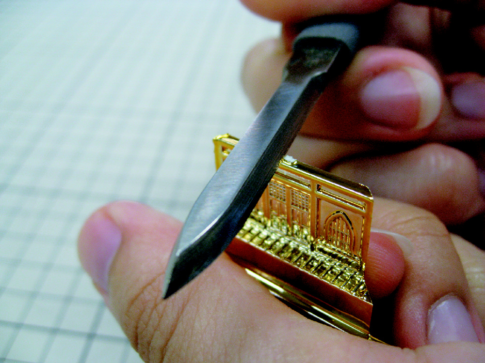 ■「きさげカッター」の刃部分を笹の葉型にしたことによりパーティングラインや合わせ目をピンポイントで切削が可能です。さらに持ち手からのびた直線刃により切削角度に合わせやすくなり、ゲート処理や接着面のメッキ剥がしにも最適です。