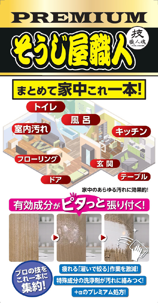 範囲が広ければ広いほど効果を現す清掃時間短縮は「拭く」「濯ぐ」「擦る」など一番大きなエネルギーを軽減します。プレミアム処方で+αしたこの成分は、更に汚れ落としをパワーアップさせます。