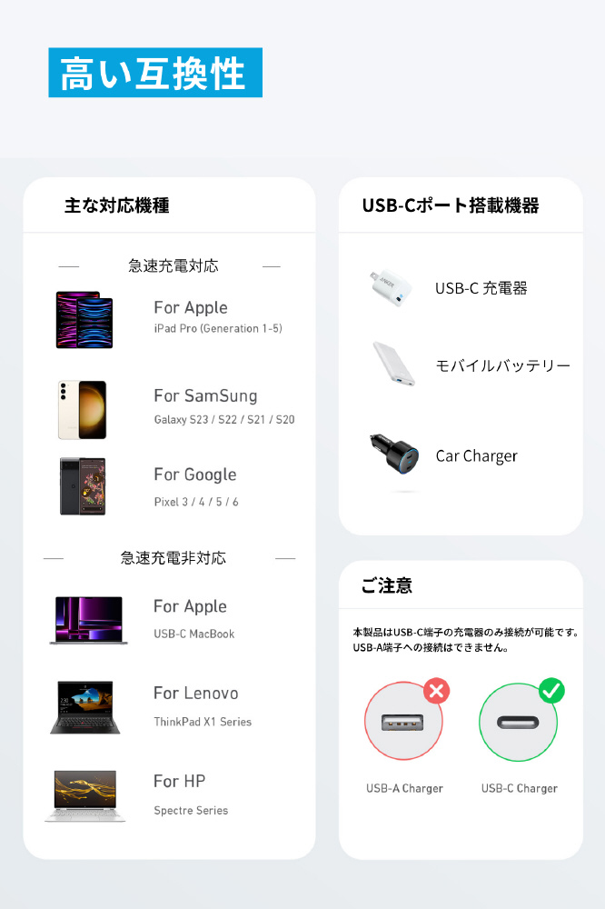 USB-IF準拠に加え、弊社による厳格な品質検査を実施しており、お使いのUSB-C端子機器を安全にかつ急速充電していただけます。