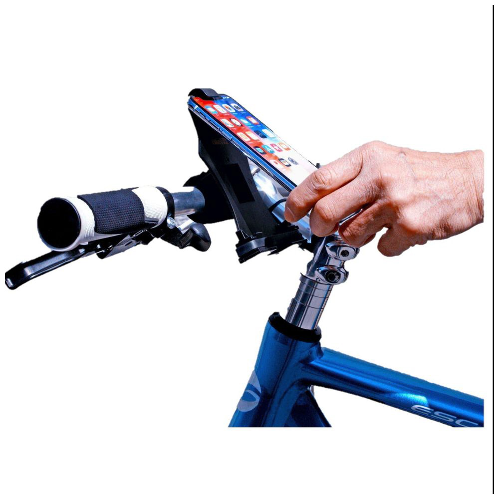 自転車用スマートフォンホルダー。スマホの取り付け取り外しがわずか1〜2秒で完了。通勤・通学時に手に持つ必要がなくなるので安全。位置情報ゲームでも便利。