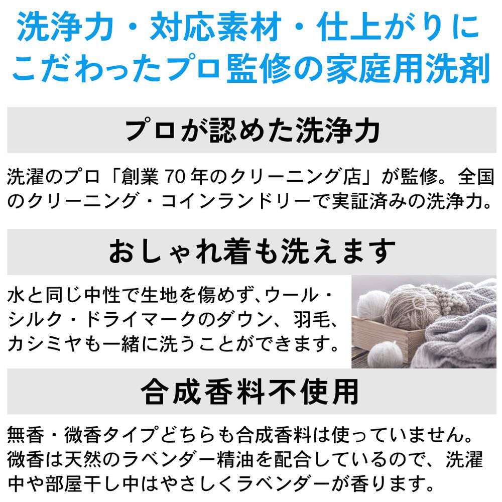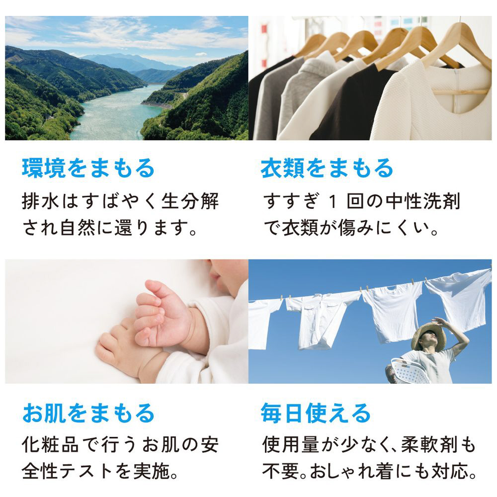 全国のクリーニング店とコインランドリーで認められた洗浄力。でも、中性なので、汚れは落ちても色が落ちにくく、すすぎが1回なので生地へのダメージを最小限に抑えられます。ウール・シルクなども一緒に洗うことができます。