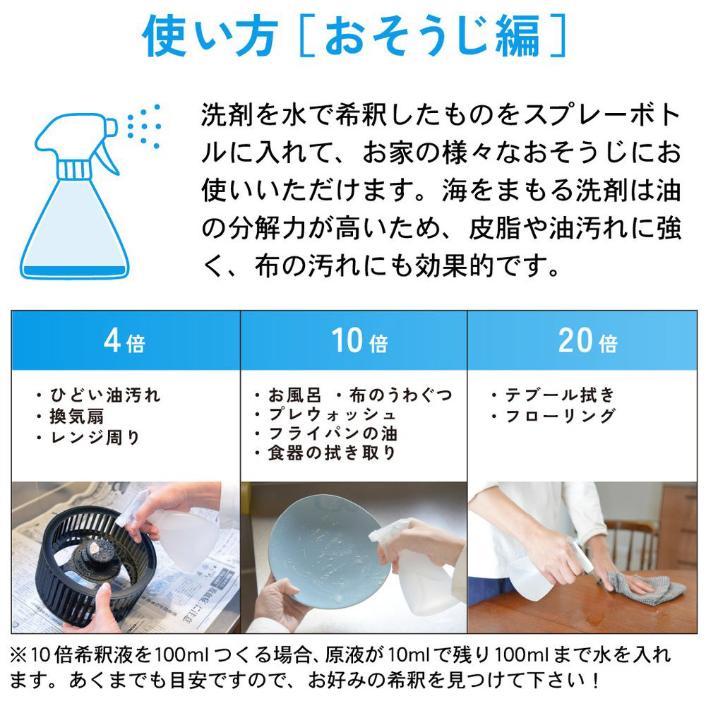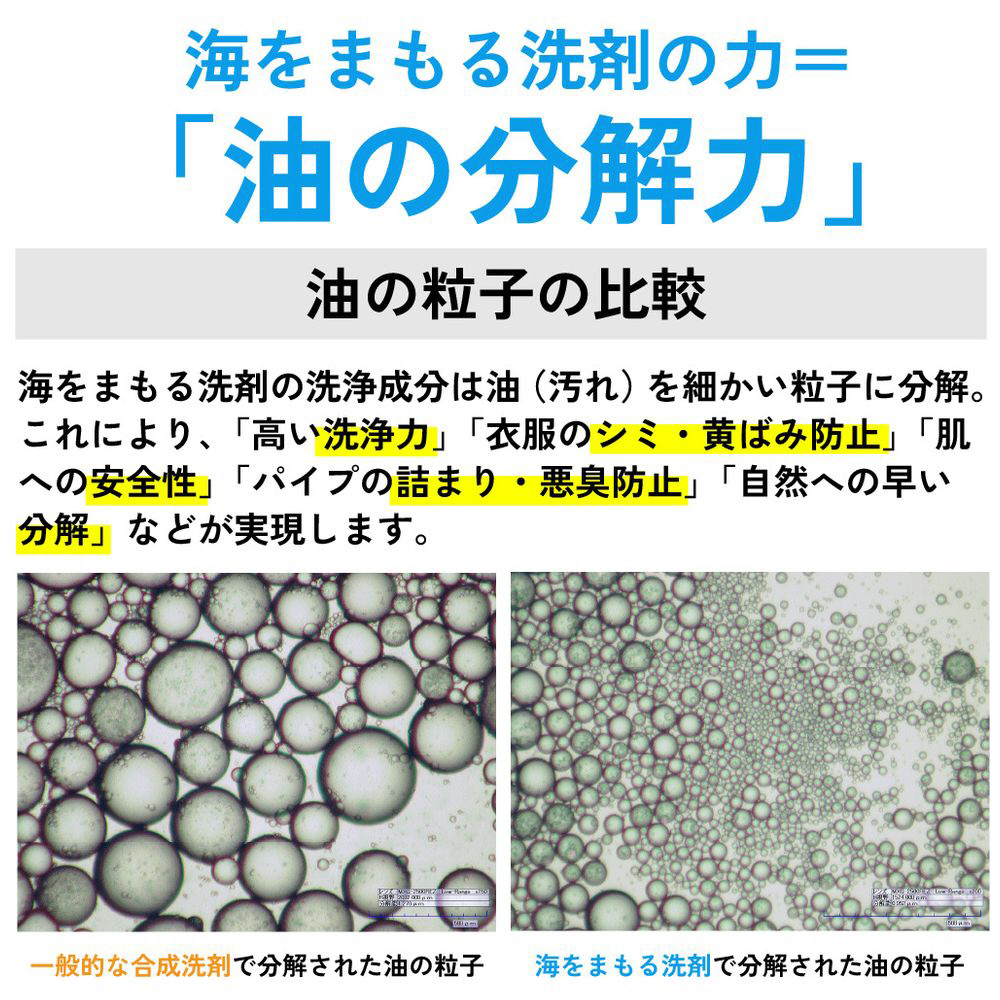 海をまもる洗剤は、「油をナノレベルに細かくし水に閉じ込める独自の技術」により、環境負荷を大幅に軽減させながら全国のコインランドリーで使われるほどの洗浄力をもったエシカル洗剤です。