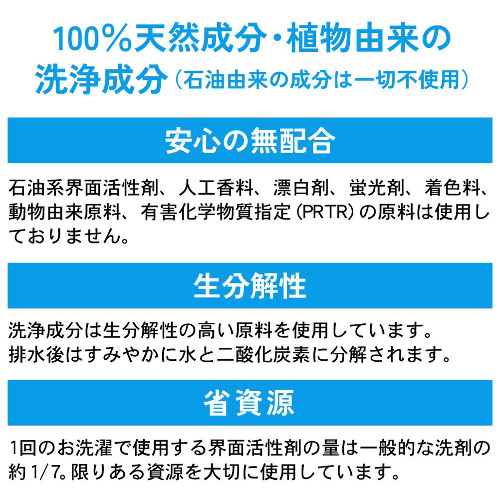 100%天然成分・植物由来の洗浄成分で、石油由来の成分、人工香料、漂白剤、蛍光剤、着色料、動物由来原料、有害化学物質指定(PRTR)の原料も不使用です。微生物分解を促進させ、洗浄成分は二酸化炭素と水に分解され自然に還ります。