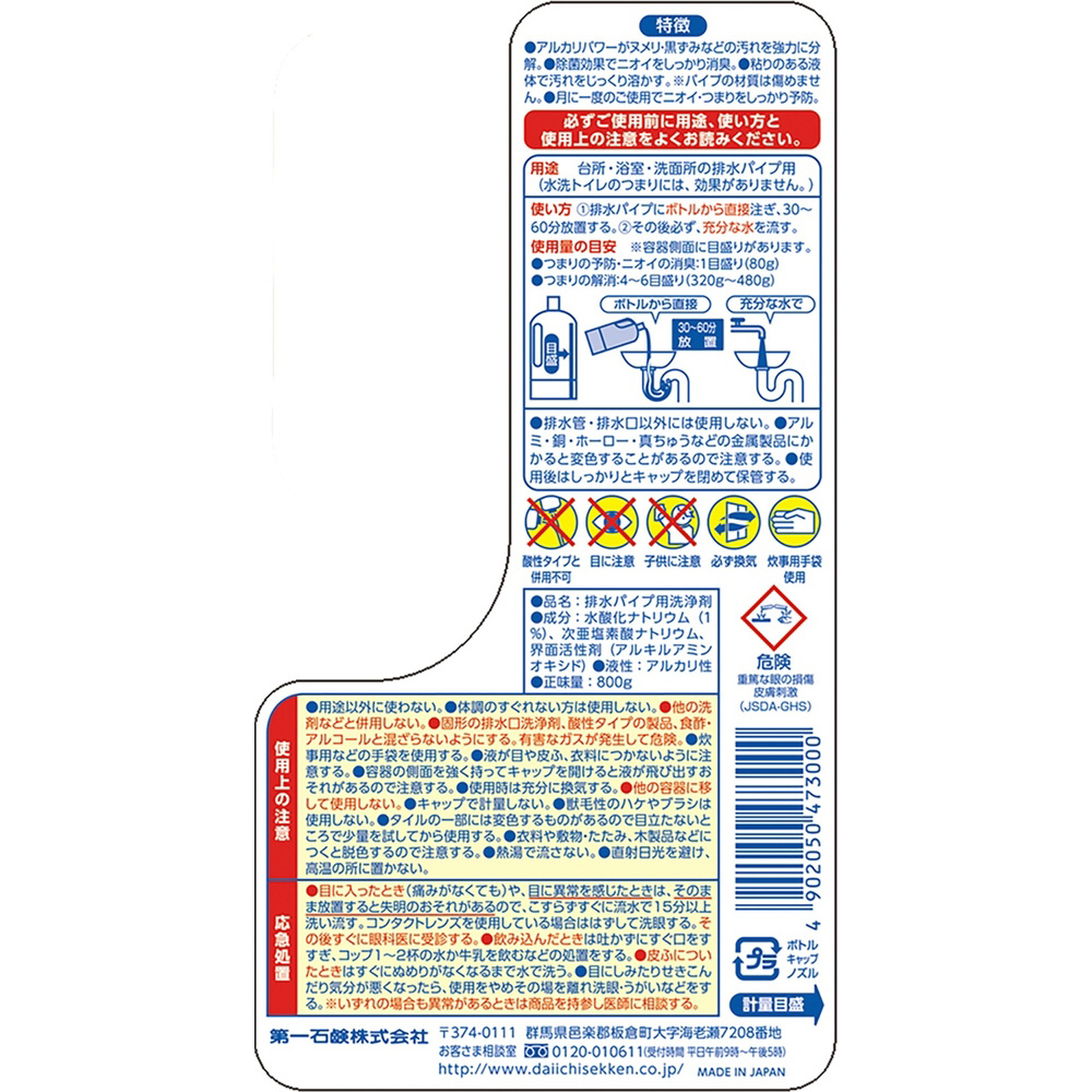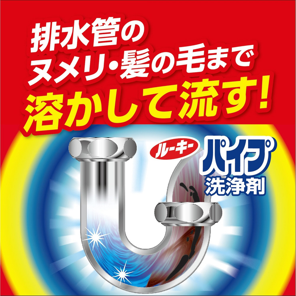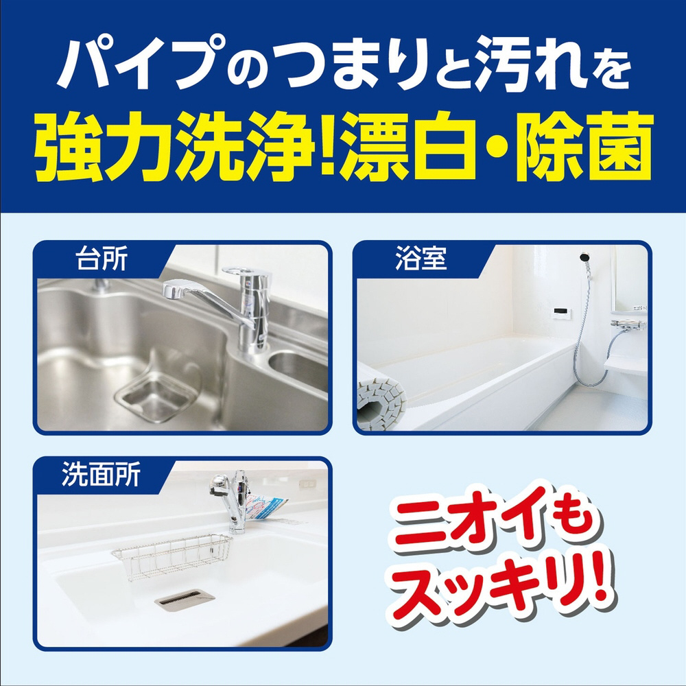 浴室・洗面所・台所のパイプのつまりと汚れを、強力に洗浄します。漂白・除菌効果で、ニオイもスッキリ解消。粘りのある液体でヌメリ、髪の毛までじっくり溶かします。