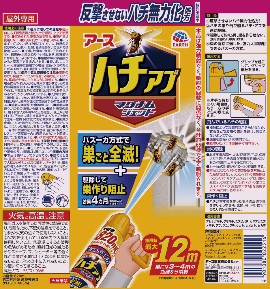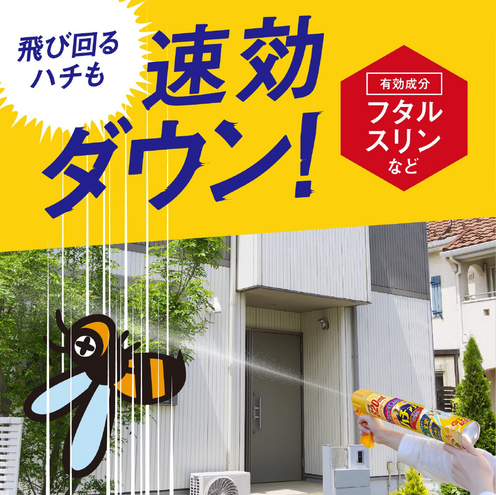速効性、致死効果に優れた有効成分を配合。ハチの巣や飛び回るハチ・アブを速効駆除。