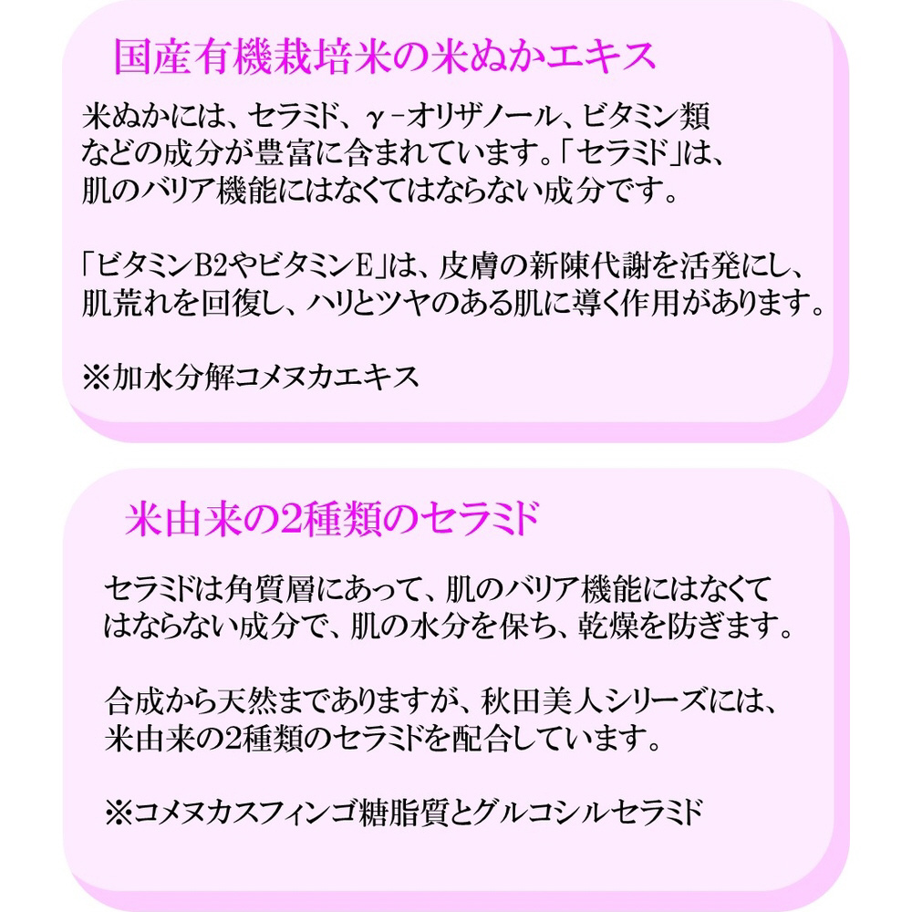 国産有機栽培米の米ぬかエキスと米セラミドにヒアルロン酸も配合。