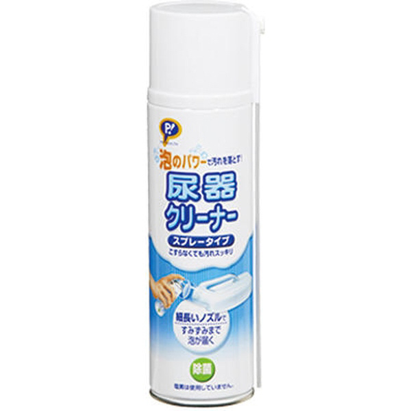 泡のパワーで汚れを落とすスプレータイプの尿器クリーナー。細長いノズルですみずみまで泡が届く。ブラシでこすらなくても汚れスッキリ