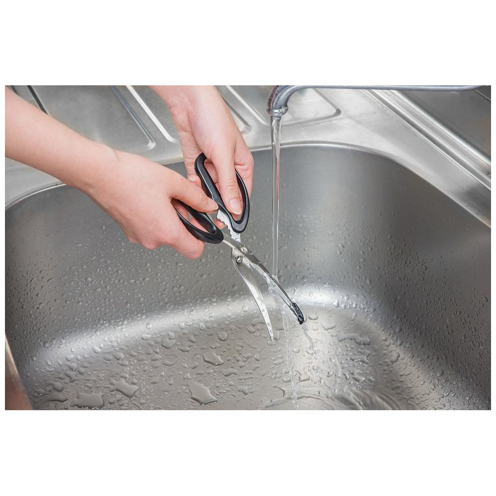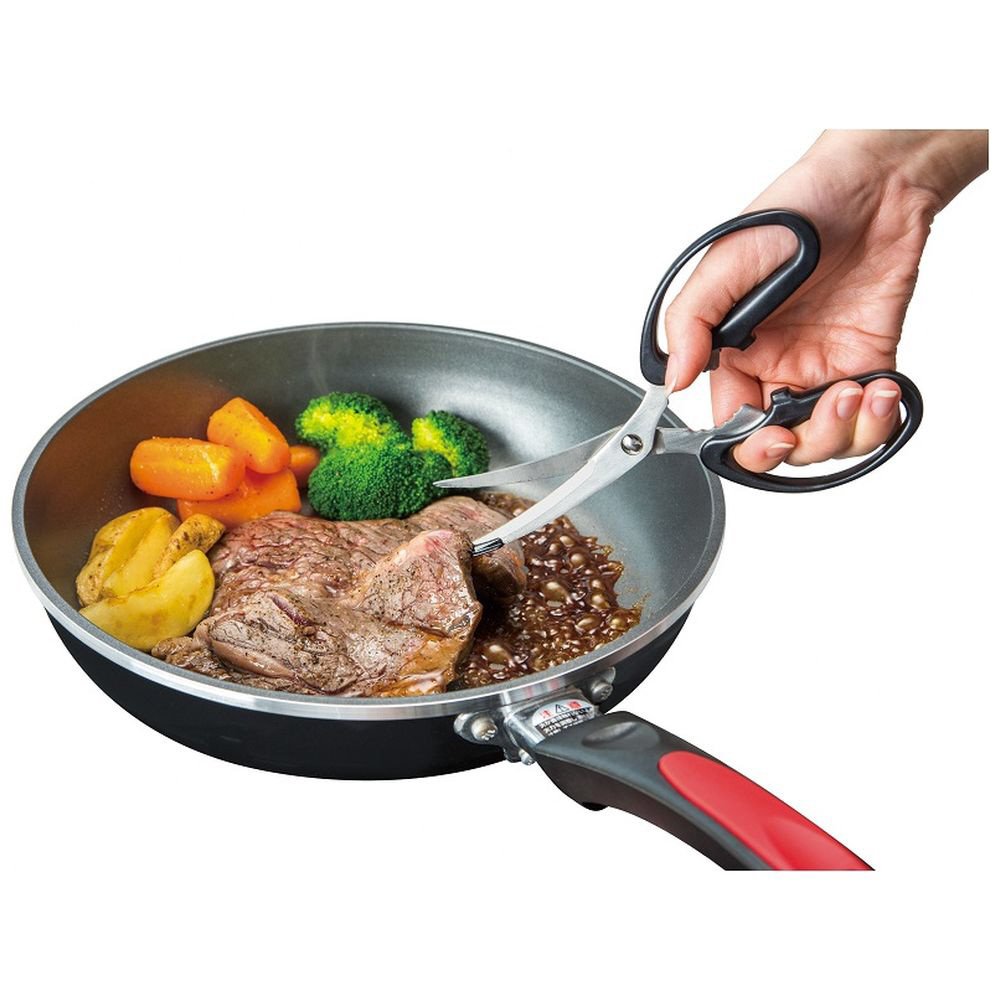 フライパンやホットプレート、食品トレーの上で食材をカットできる刃先ガード付きキッチンはさみ