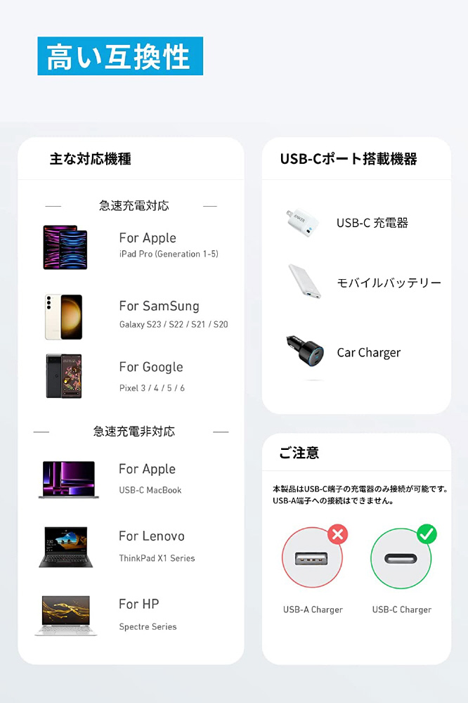 USB-IF準拠に加え、弊社による厳格な品質検査を実施しており、お使いのUSB-C端子機器を安全にかつ急速充電していただけます。