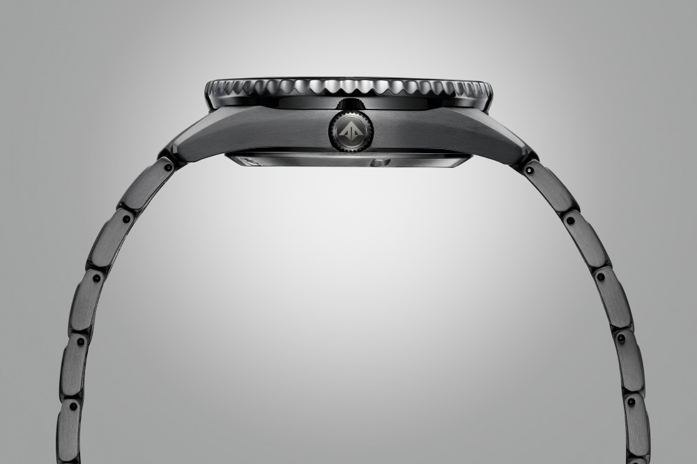 ■サイドビューから垣間見える甲丸なデザイン、すり鉢状のベゼル、ケース幅、ミラーとヘアラインの仕上げなど「チャレンジダイバー」を踏襲したデザインが懐かしさを感じさせます。