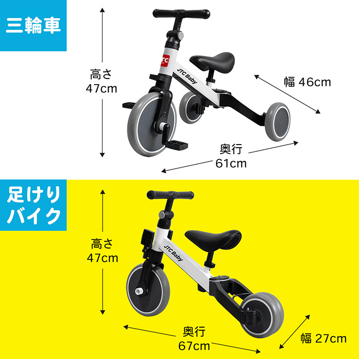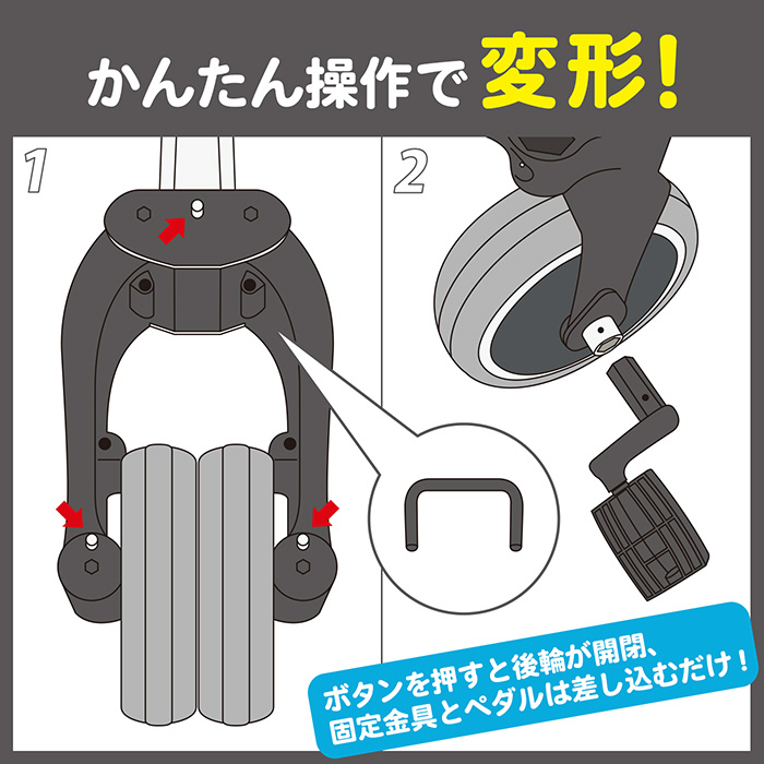 工具なしで足けりバイクに変形できる三輪車