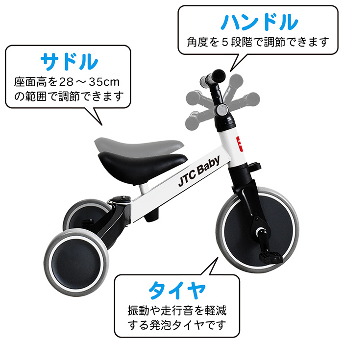 ●1歳半から乗れてお子様の成長に合わせてサドルの高さを調整できたり、ハンドルの角度を5段階調節できます。