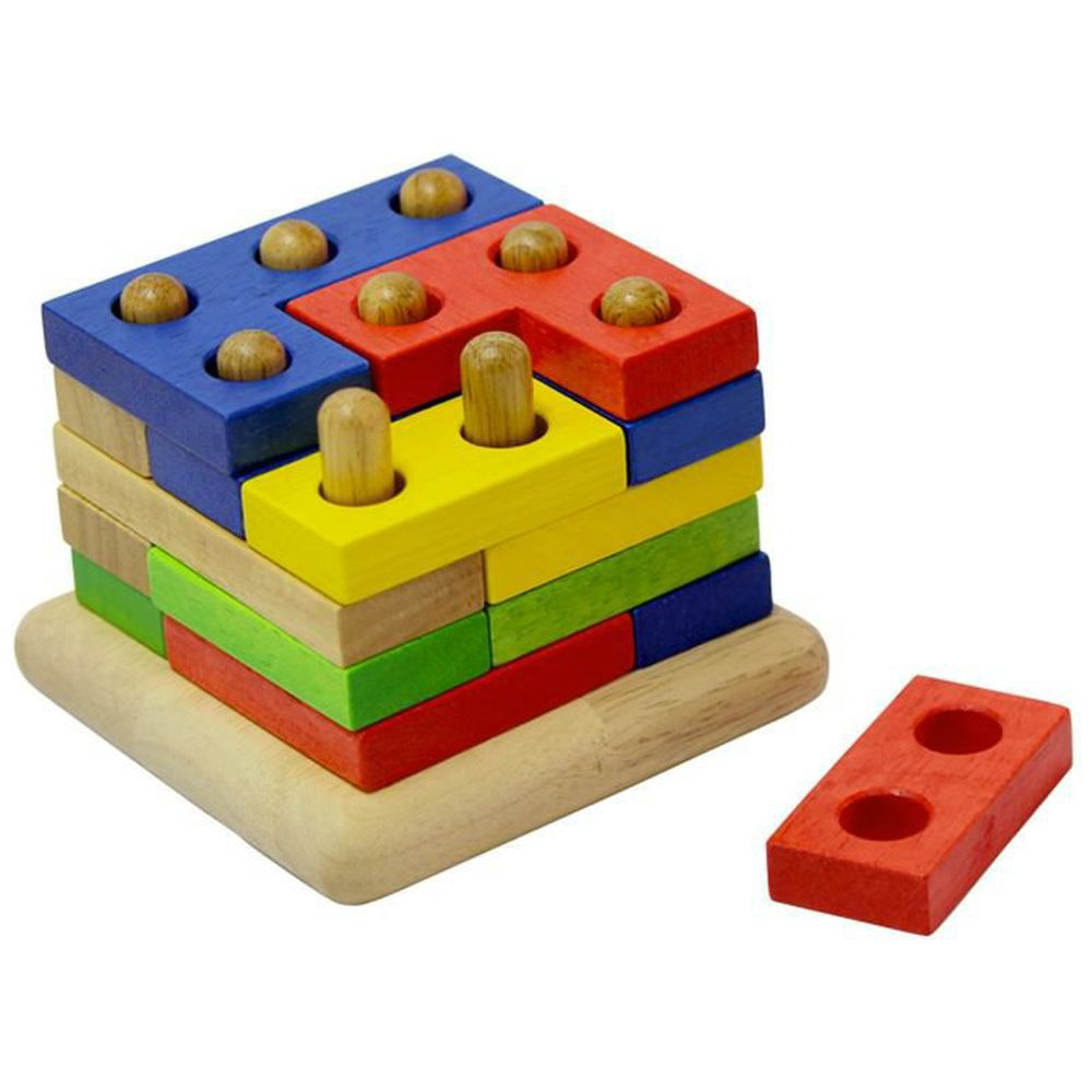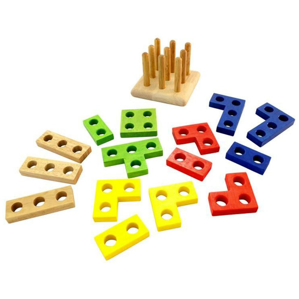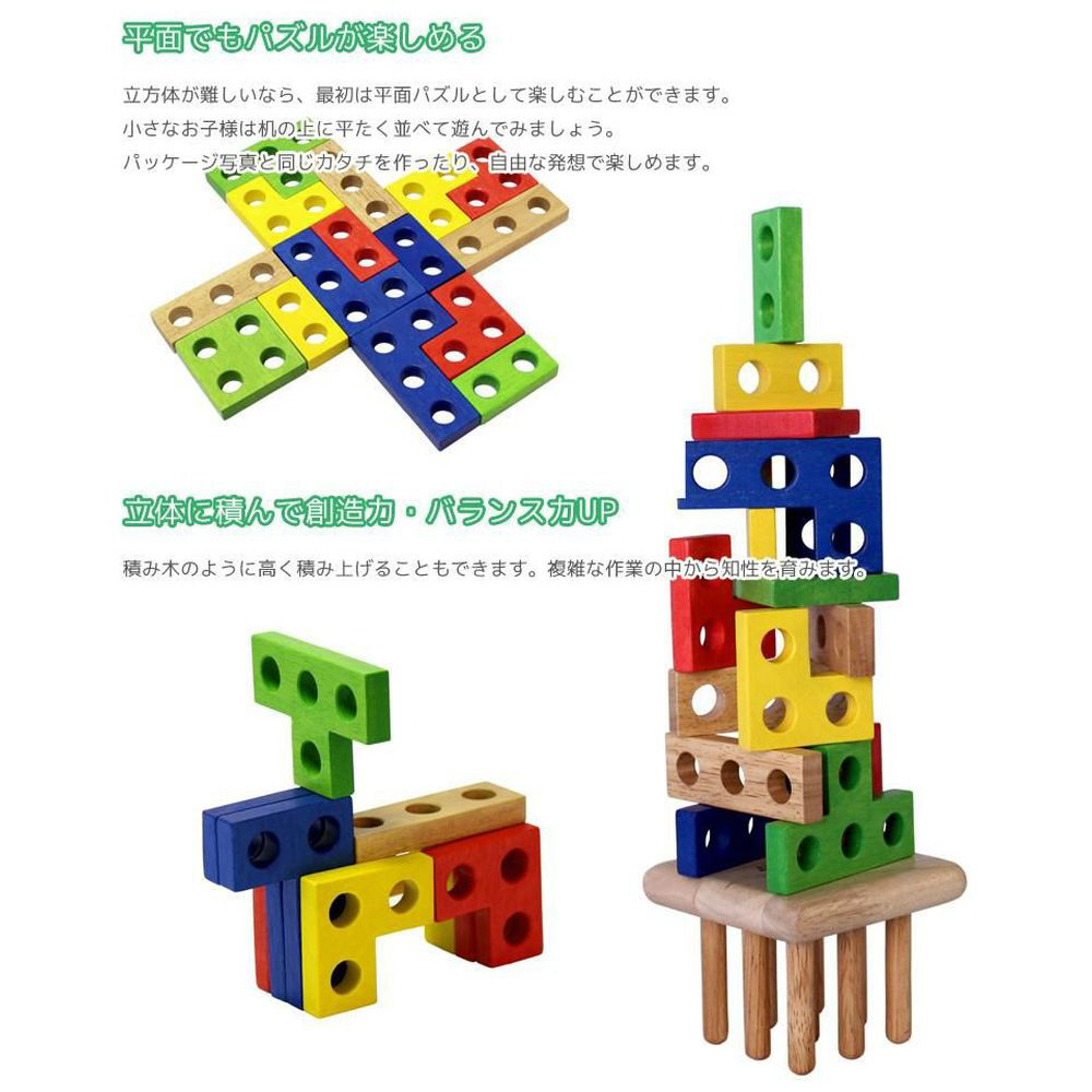 色カタチの違うパーツをパズルのように組み合わせて、本体に積み上げていく木のおもちゃのゲームです。パーツを本体に積み上げるほか、パーツだけでも積み木のように遊ぶこともでき、創造力の発達をサポートします。