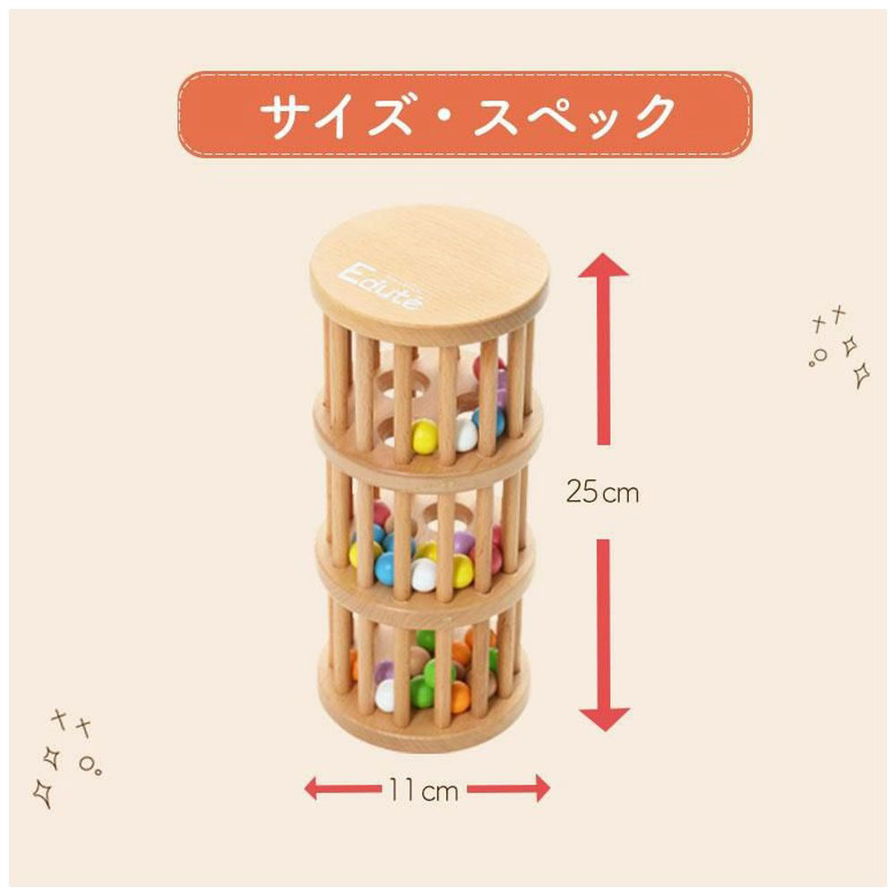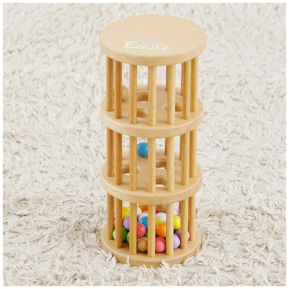 高さ25cmの3段タワーの中で、32個のボールが軽快な音をたてて落ちていきます。タワーを横に倒して転がせば、違った音も楽しめます。ボールが転がる音色が赤ちゃんの耳にも優しく響く木のおもちゃです。