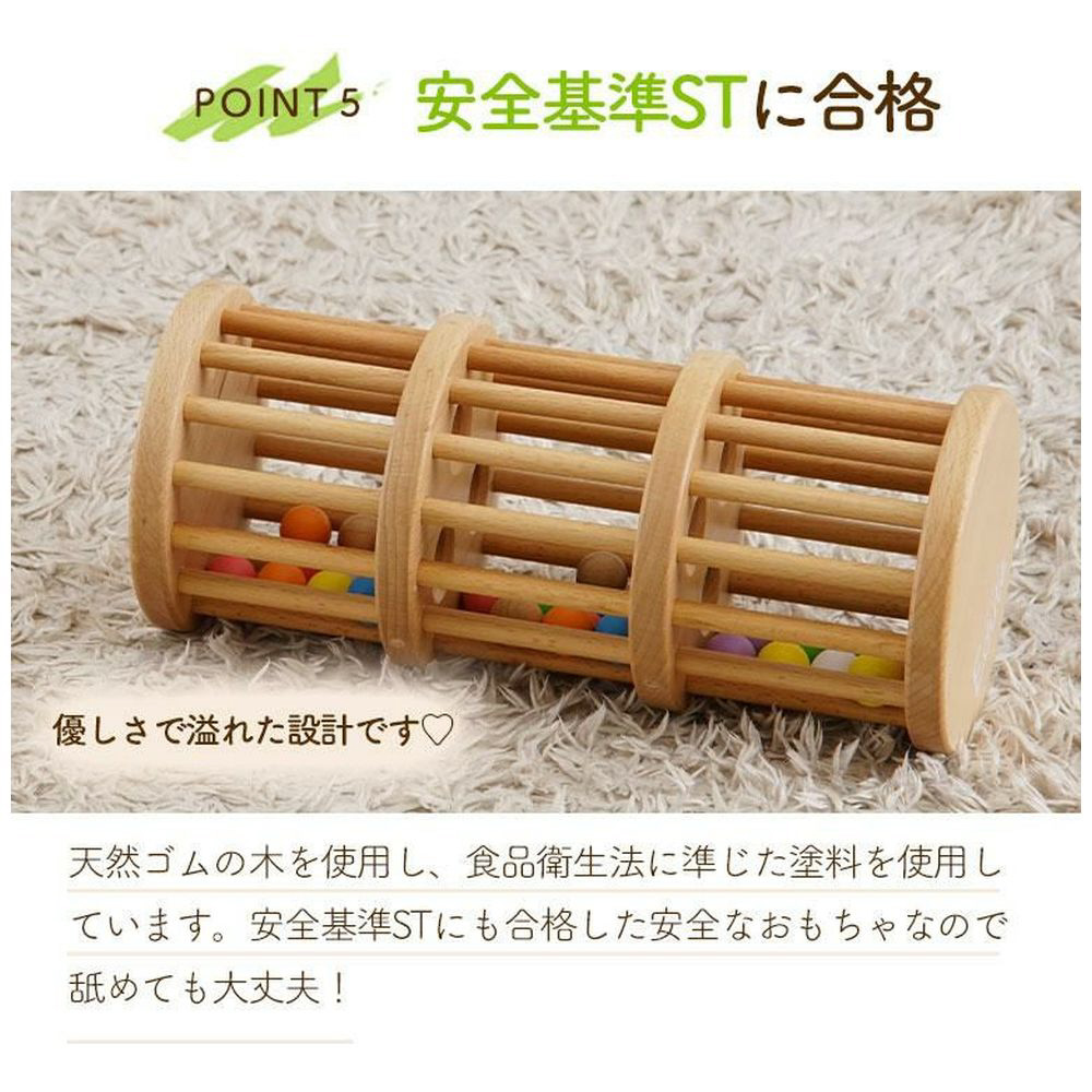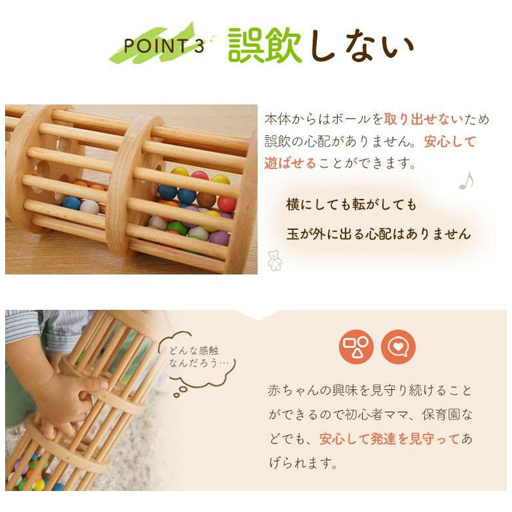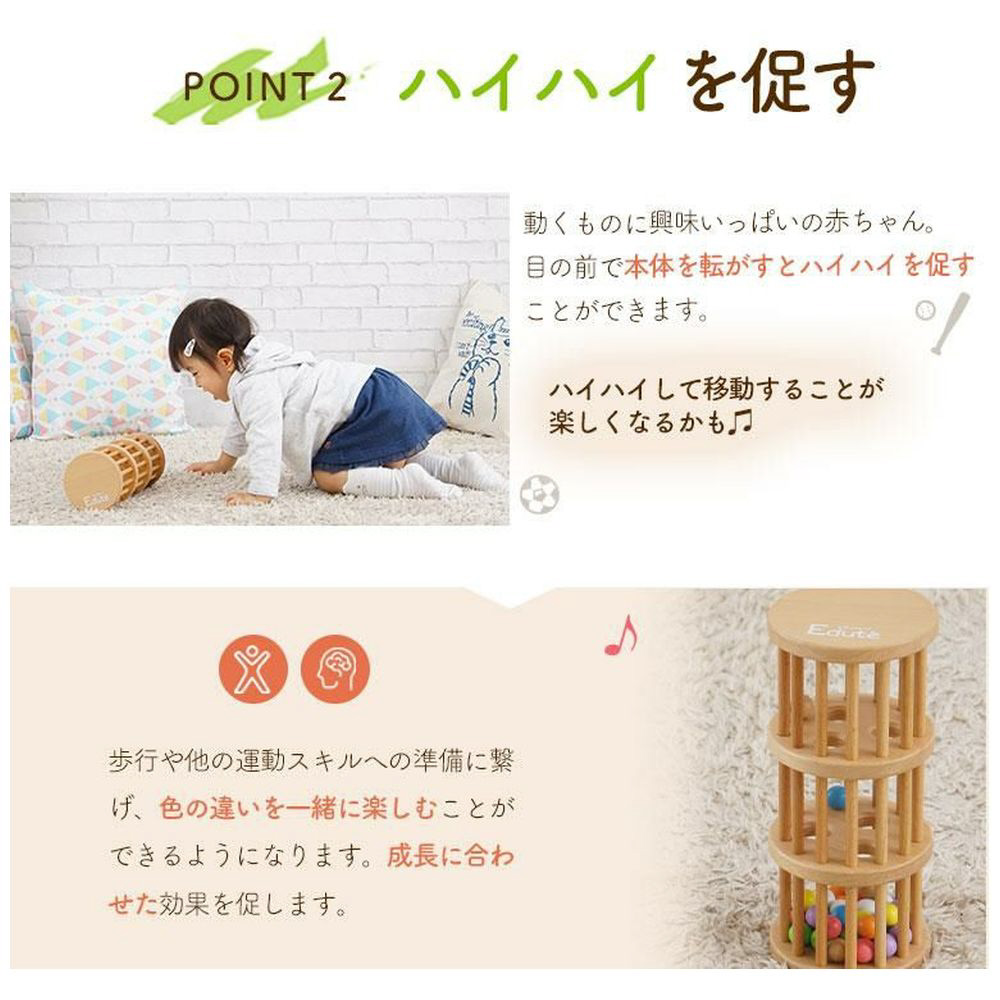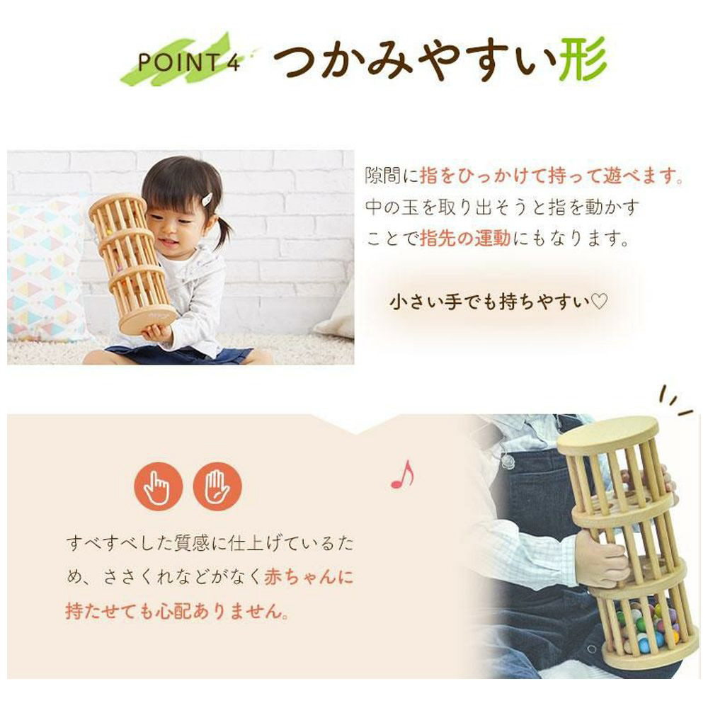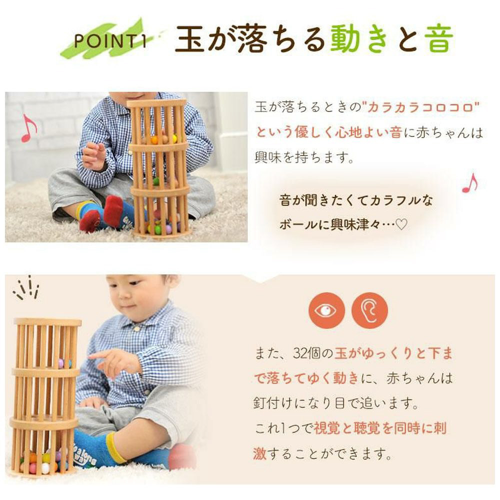 タワーを横に倒して転がせば、違った音も楽しめます。ボールが転がる音色が赤ちゃんの耳にも優しく響く木のおもちゃです。