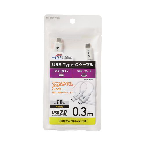タイプC ケーブル USB Type C to Type C 0.3m PD 60W対応 断線しにくい 耐久仕様 やわらかい 【 Chromebook Mac PC iPad Android スマホ タブレット Nintendo Switch 等 Type-C 機器対応 】 RoHS指令準拠 ホワイト