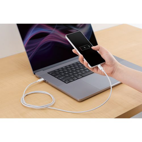 柔軟さを持った線材設計で断線に強く、取り回しがしやすいため束ねて持ち歩くのに便利な、やわらか耐久ケーブルです。USB Type-C(TM)ポートを搭載したパソコン・充電器と、USB Type-C(TM)ポートを搭載したスマートフォンを接続して充電・データ通信ができます。USB Power Delivery(最大60W)に対応し、スマートフォン・タブレットの高速充電に対応しています。