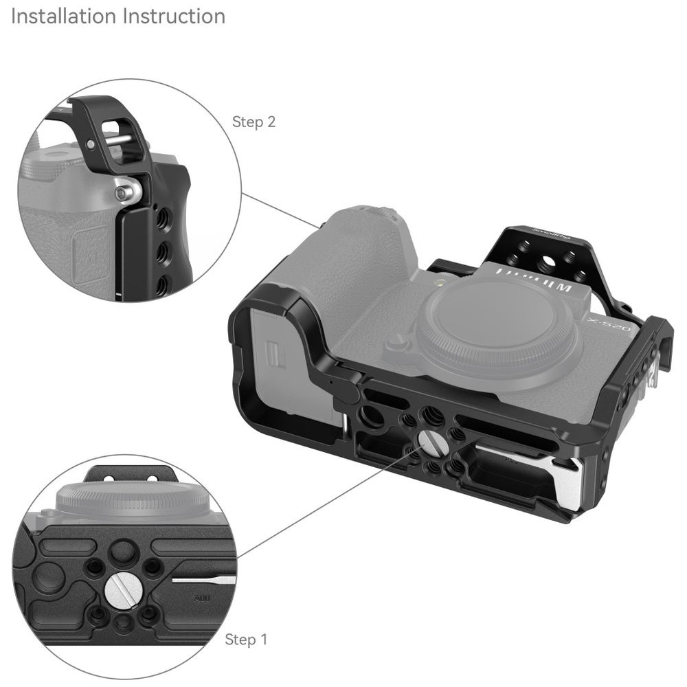 FUJIFILMX-S20用ケージ4230は、カメラを保護し、アクセサリーを装着できるように設計されています。FUJIFILMX-S20のロックは、底面に1/4-20ネジ1本、ケージ右側面にM2.5ネジ1本を介して行います。ボタン、カードスロット、フリップスクリーン、バッテリードアにフルアクセスが可能で、傷を防ぐラバーパッドが付属しています。