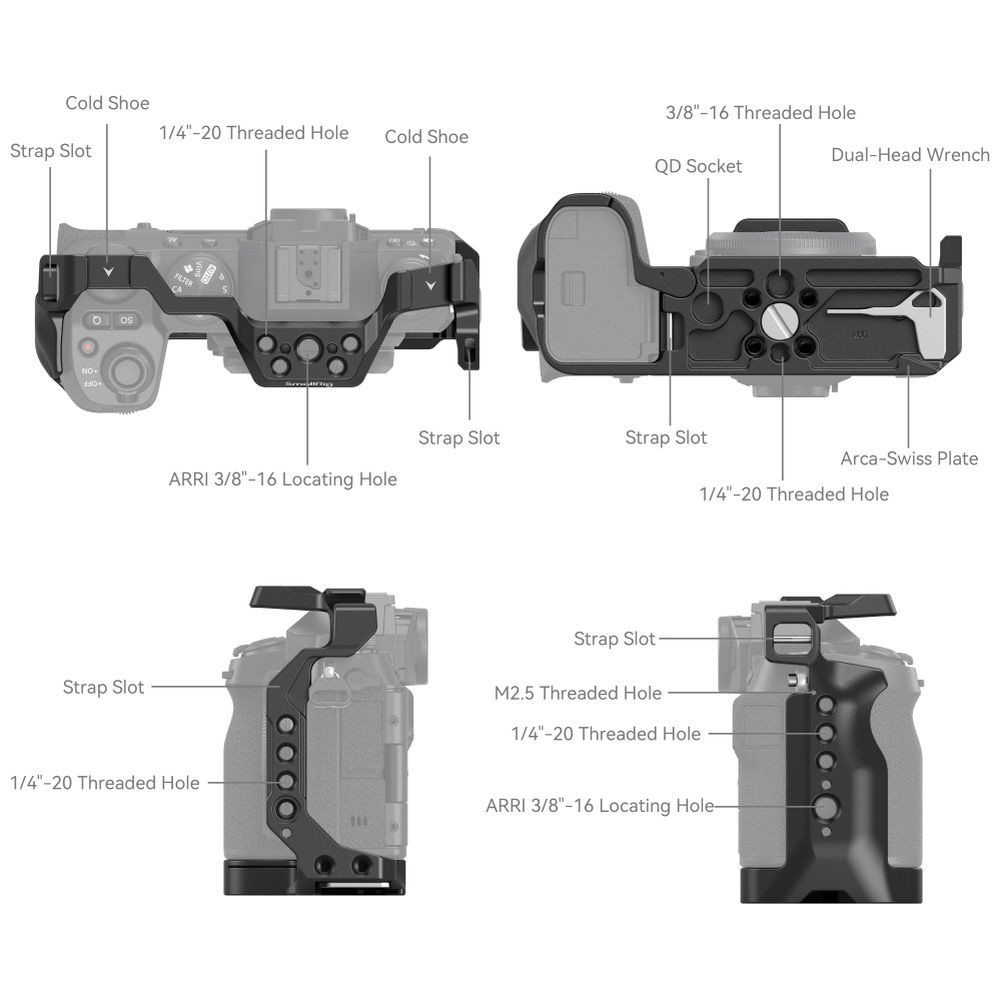 3.1/4-20ネジ穴、3/8-16ネジ穴、ARRI3/8-16位置決め穴、コールドシュー、NATOレール、QDマウント、ストラップホールなど、マルチシーンでの撮影に適した複数の取り付けポイントを備えている。