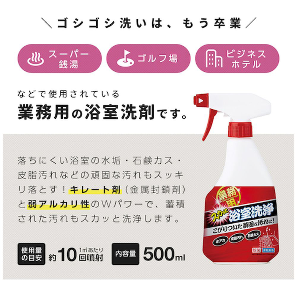 なかなか落ちない浴室の水アカや石けんカス、皮脂汚れなどのお風呂の汚れを洗浄できる業務用の浴室洗剤です。