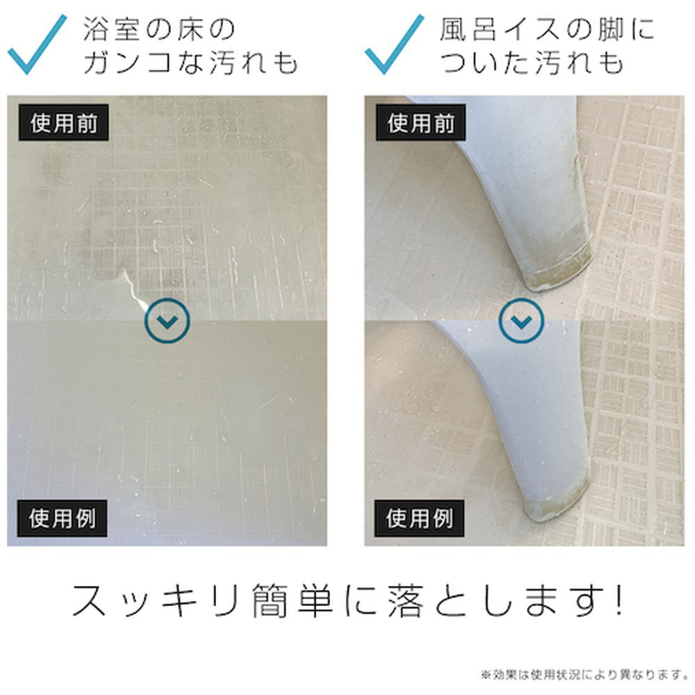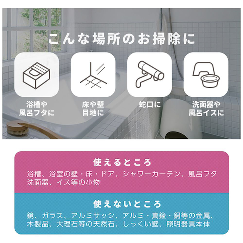 ・<使えるところ>浴槽、浴室の壁、床・ドア、シャワーカーテン、風呂フタ、洗面器、イス等の小物※材質によって、シミ・変色の恐れがありますので、必ず目立たないところで試してから使用してください。