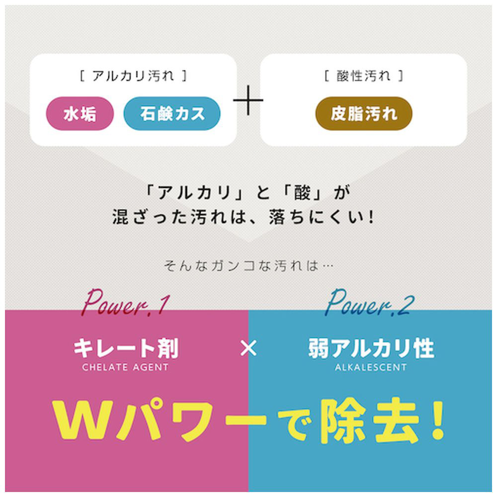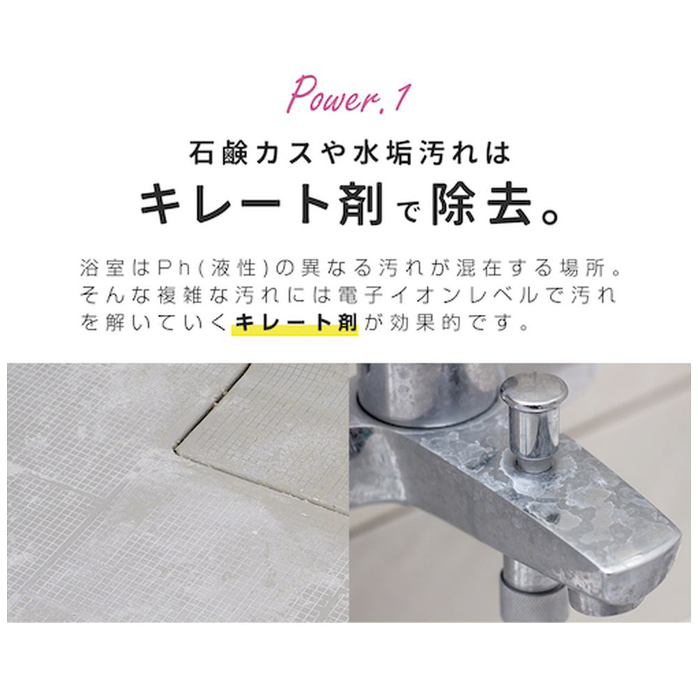 ■キレート剤が働き、蓄積された頑固な浴室汚れを除去(※キレート剤=金属イオン封鎖剤)します。