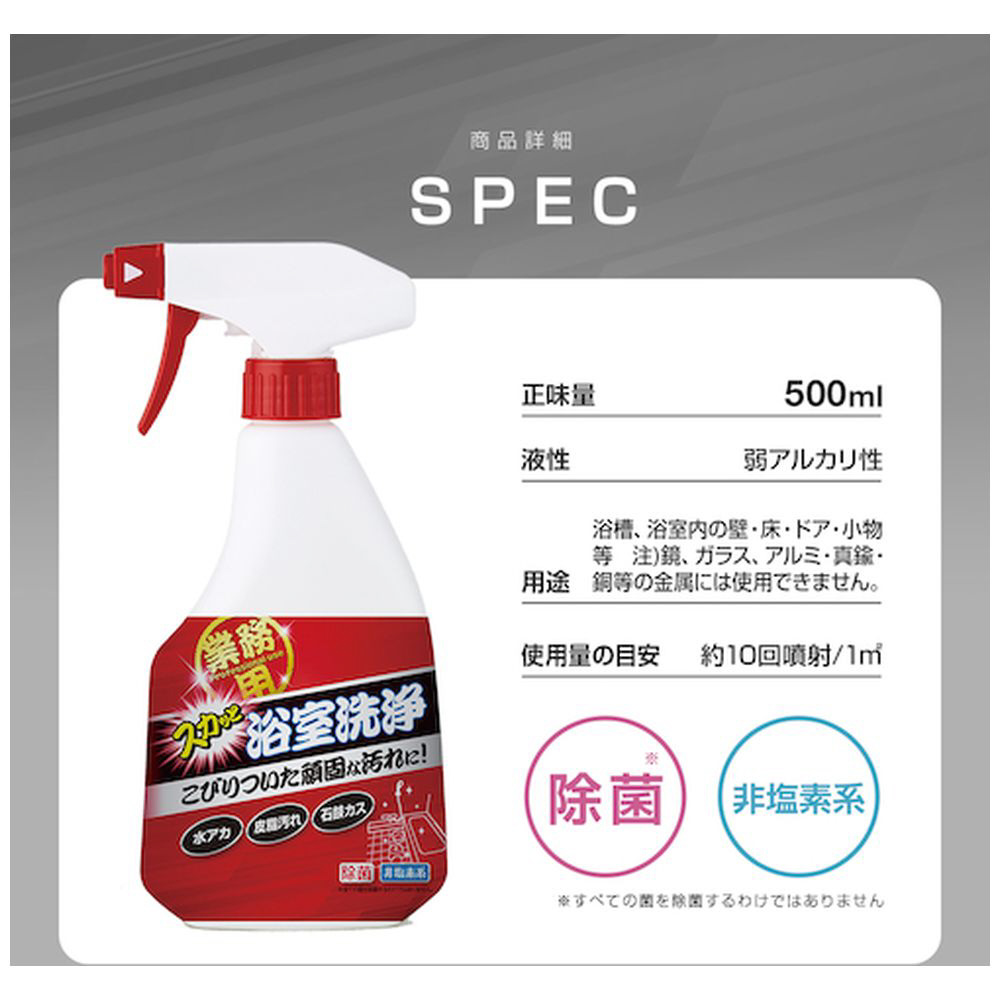 ■なかなか落ちない浴室の水アカや石けんカス、皮脂汚れなどのお風呂の汚れを洗浄できる業務用の浴室洗剤です。